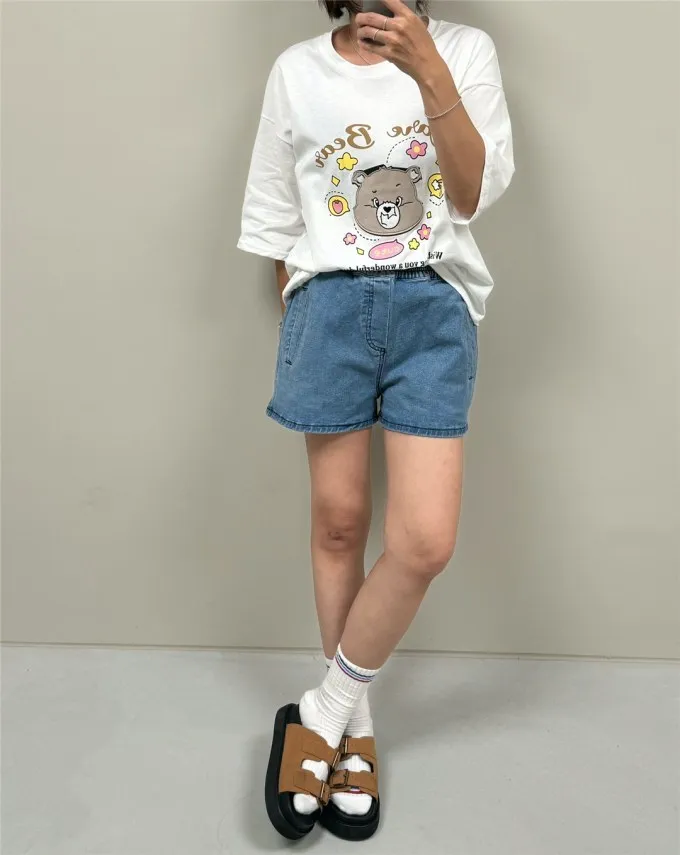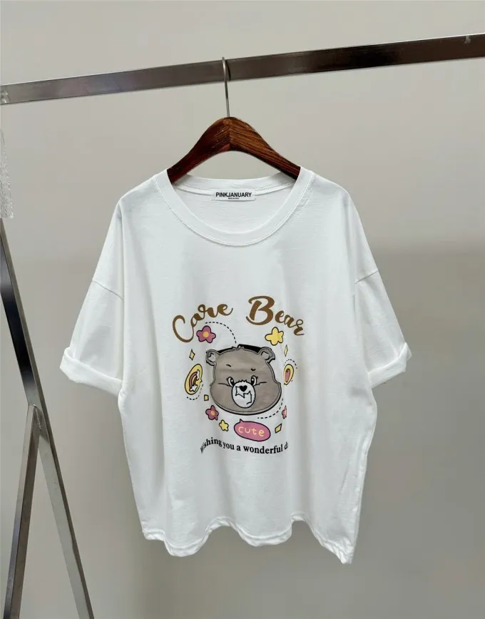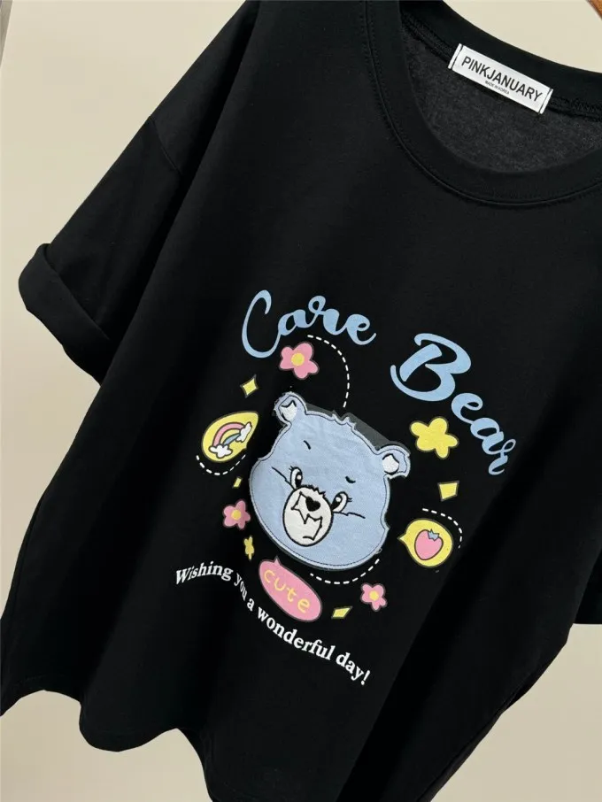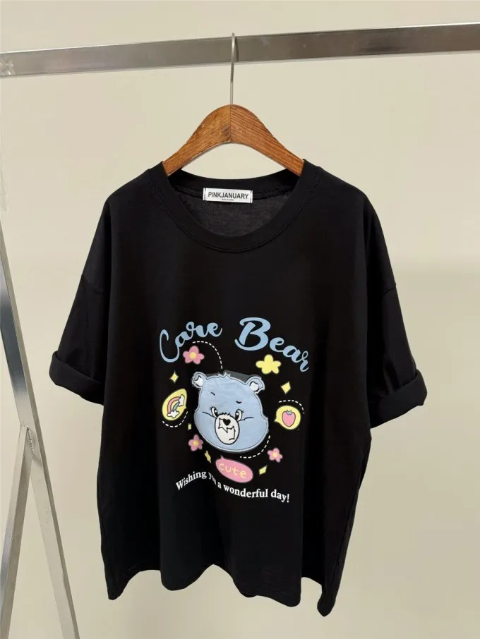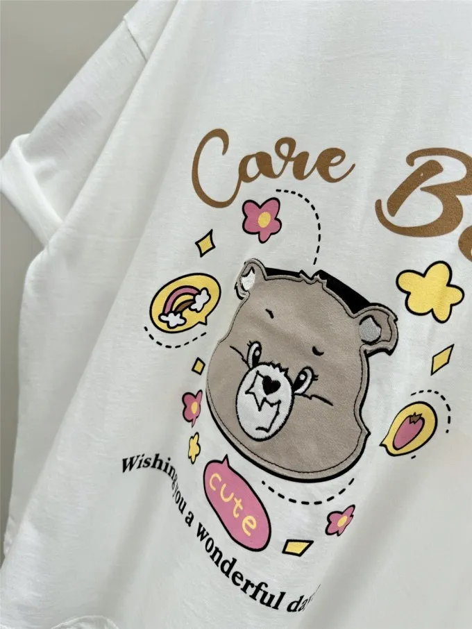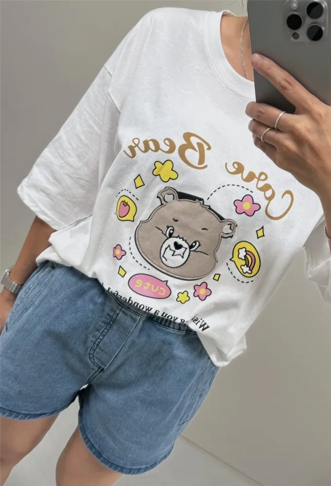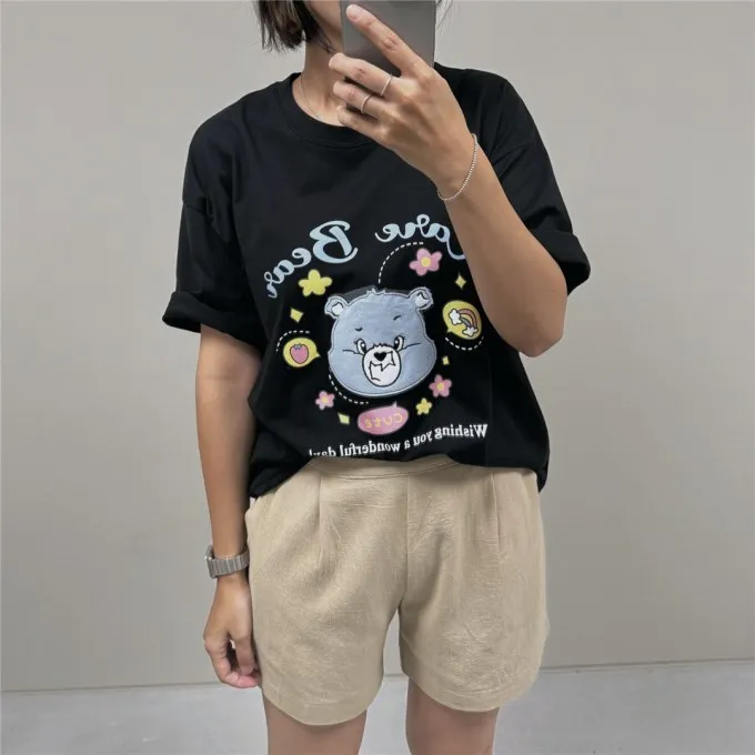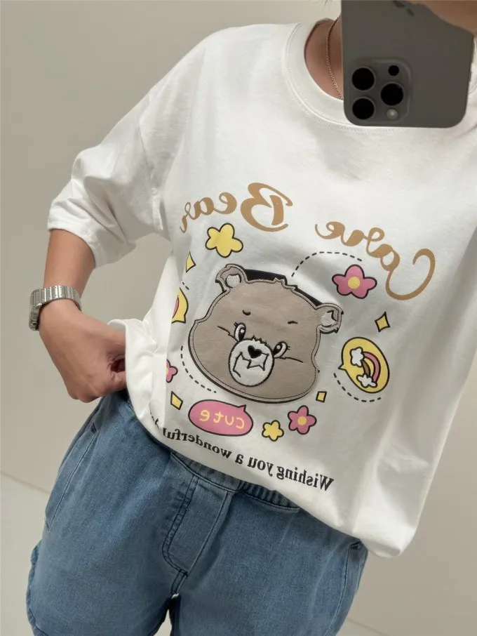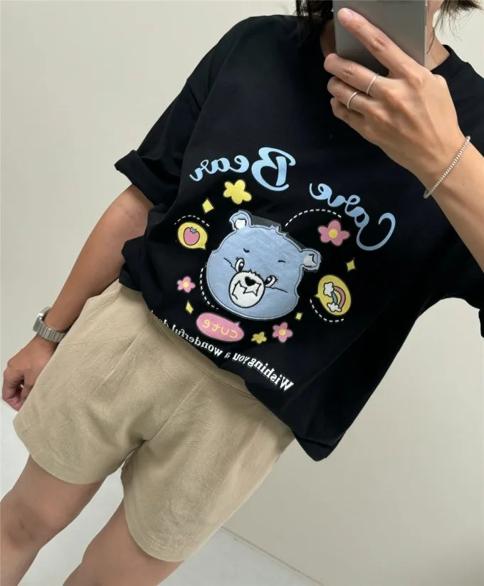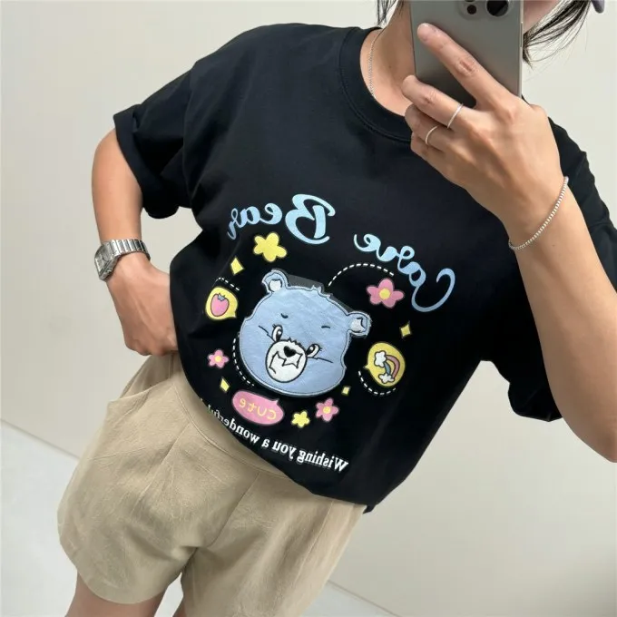 #S到XL身型可穿 撞色立體貼布熊熊 質感太好 夏末初秋 五六分袖 不買行嗎~! 印圖再加上繡圖 這CP值直接破表耶 現在新款都會接著初秋 所以一路都可以穿到10月沒問題的 開岔部分畫龍點睛 美度增加 斜剪接不呆板 水洗有挺度 不會軟趴趴 袖長五分 可反摺成短袖 不悶熱 超好穿!