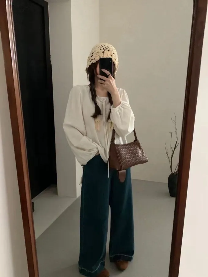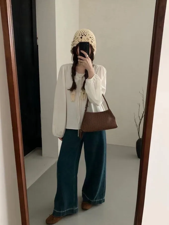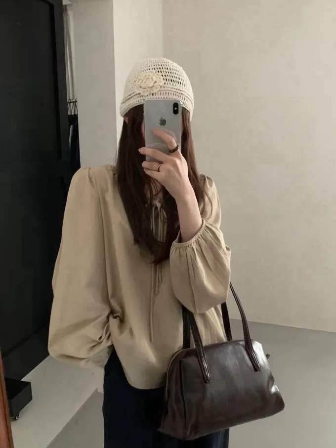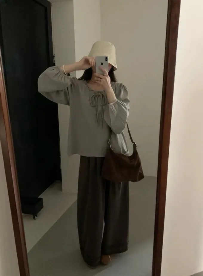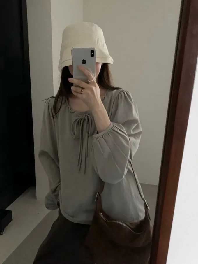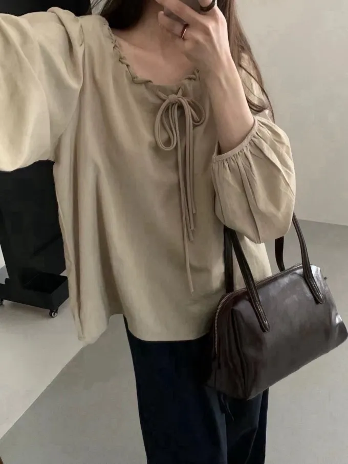 綁帶荷葉領燈籠袖上衣_A69