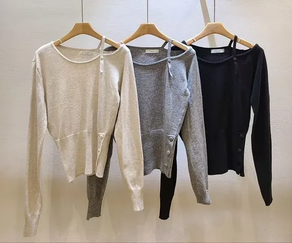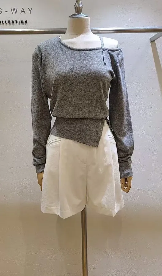 韓國 灰色斜肩針織上衣_D60