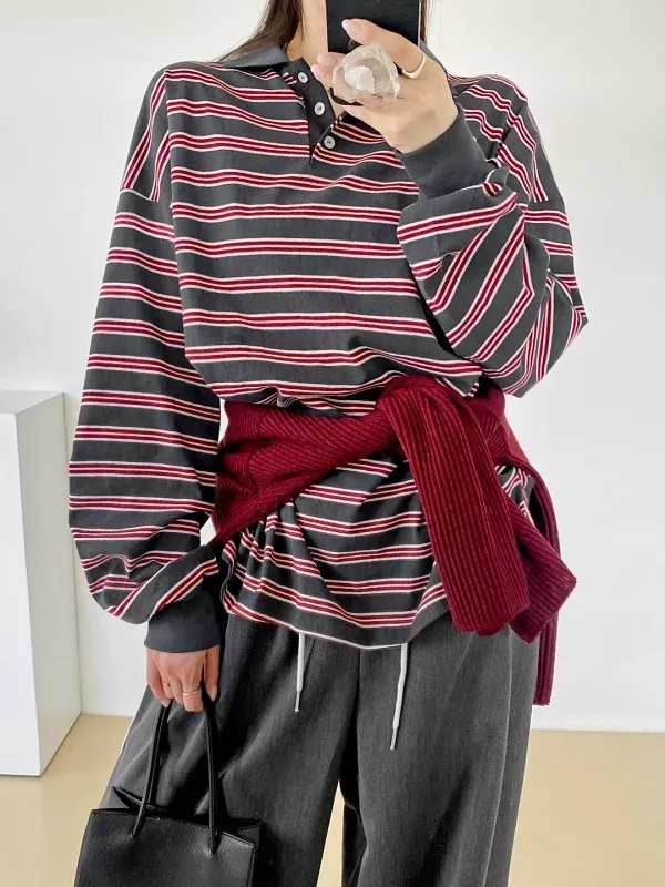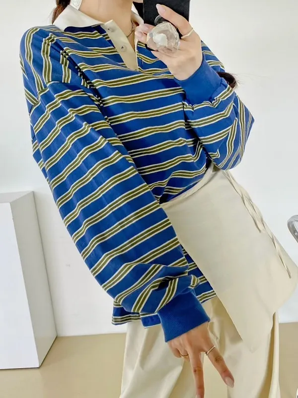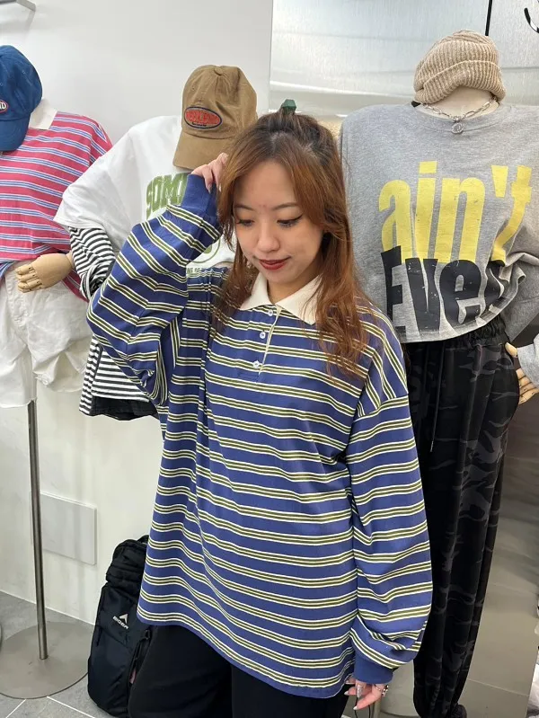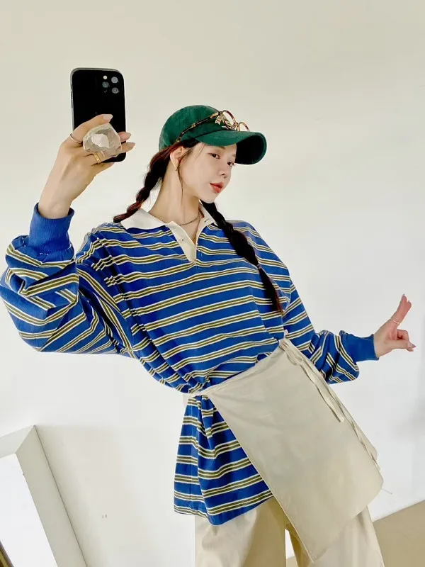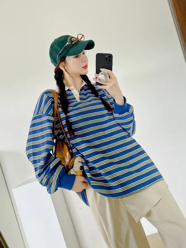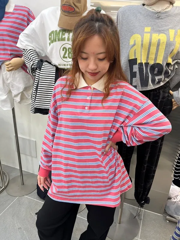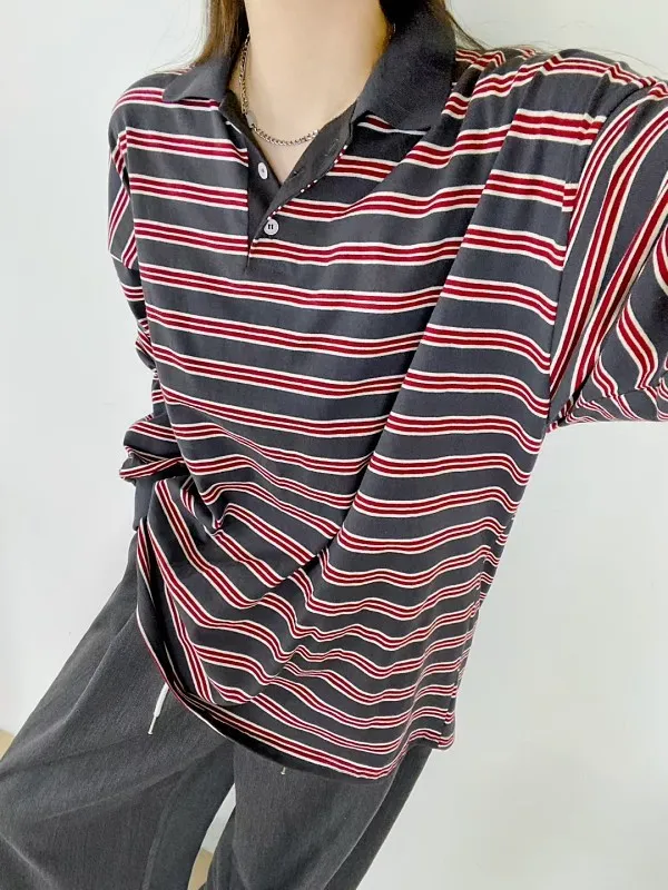 韓國 中性撞色領橫條寬鬆POLO衫_E68