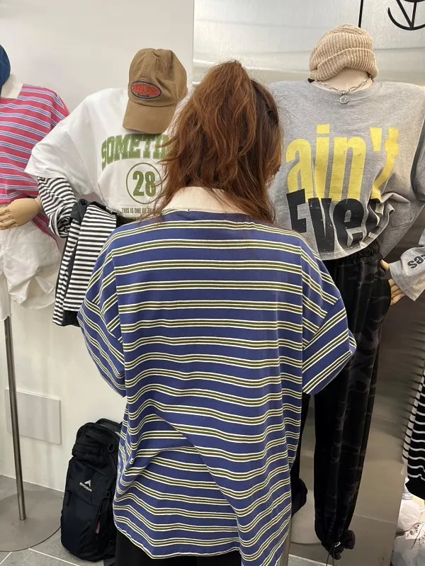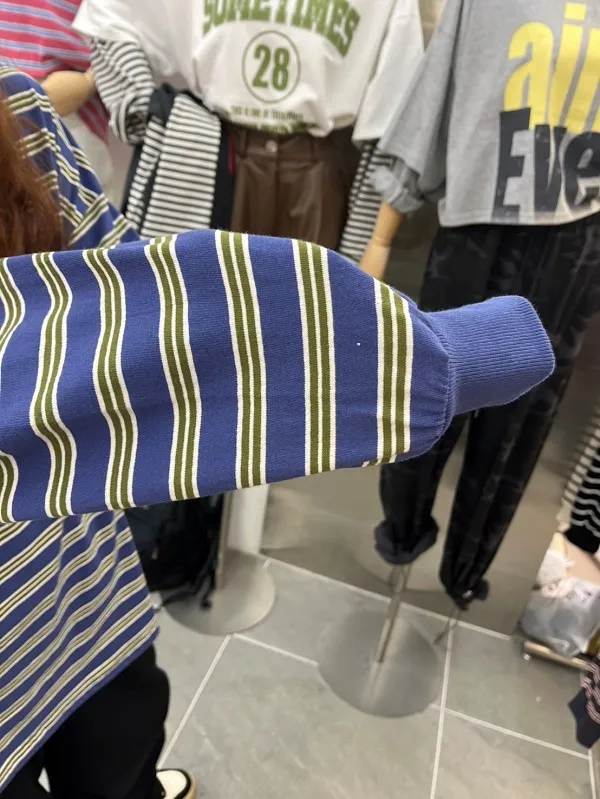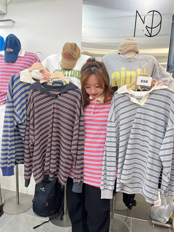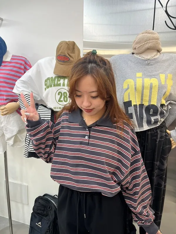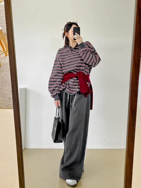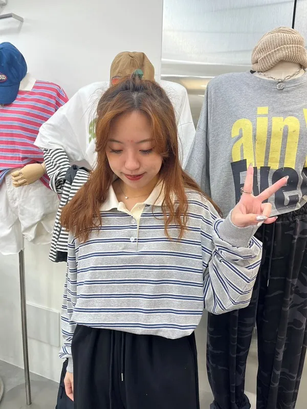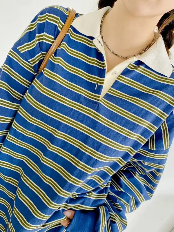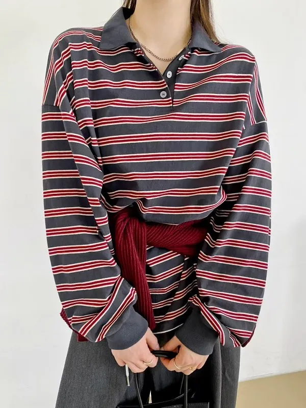 韓國 中性撞色領橫條寬鬆POLO衫_E68