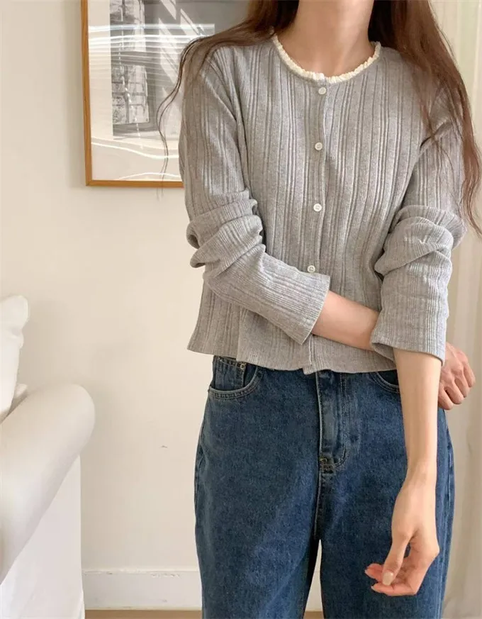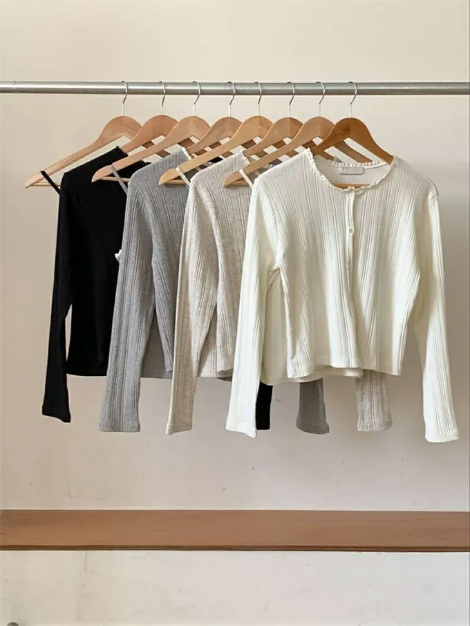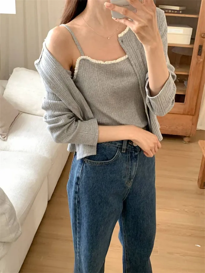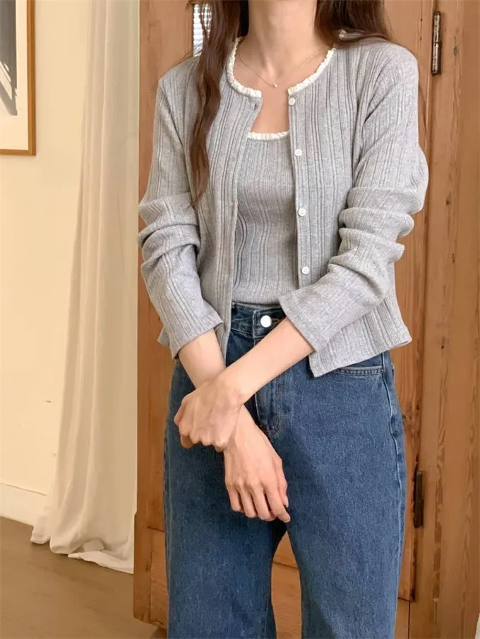 韓國 坑條圓領排扣上衣+背心_G13