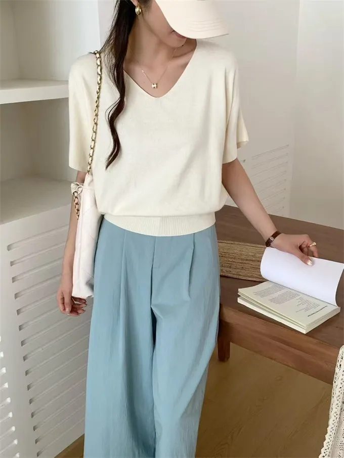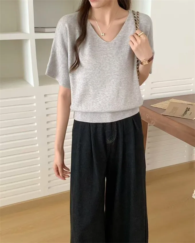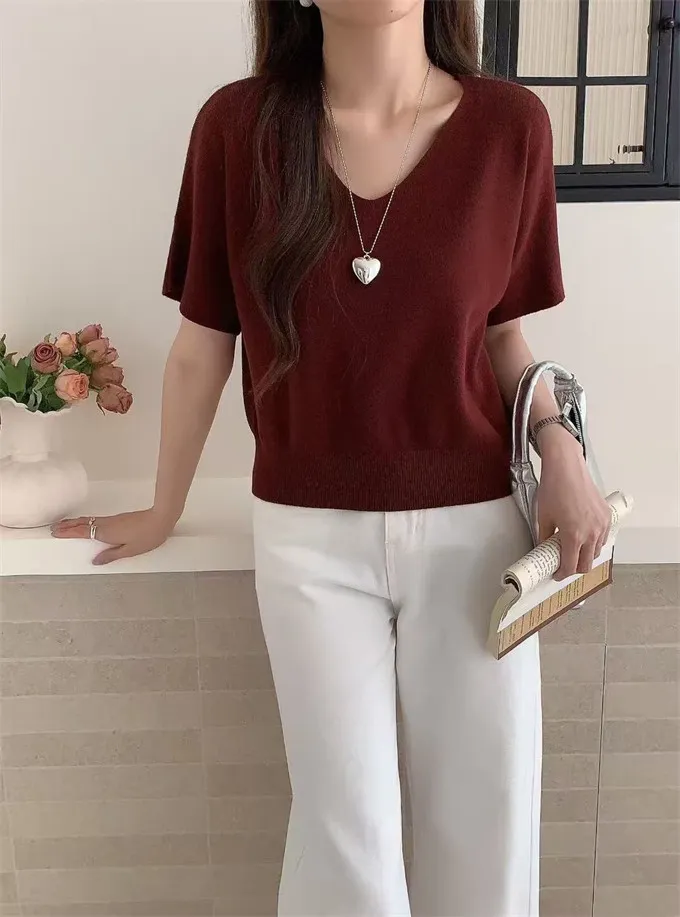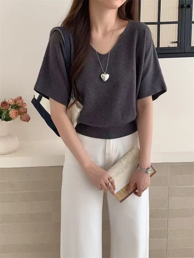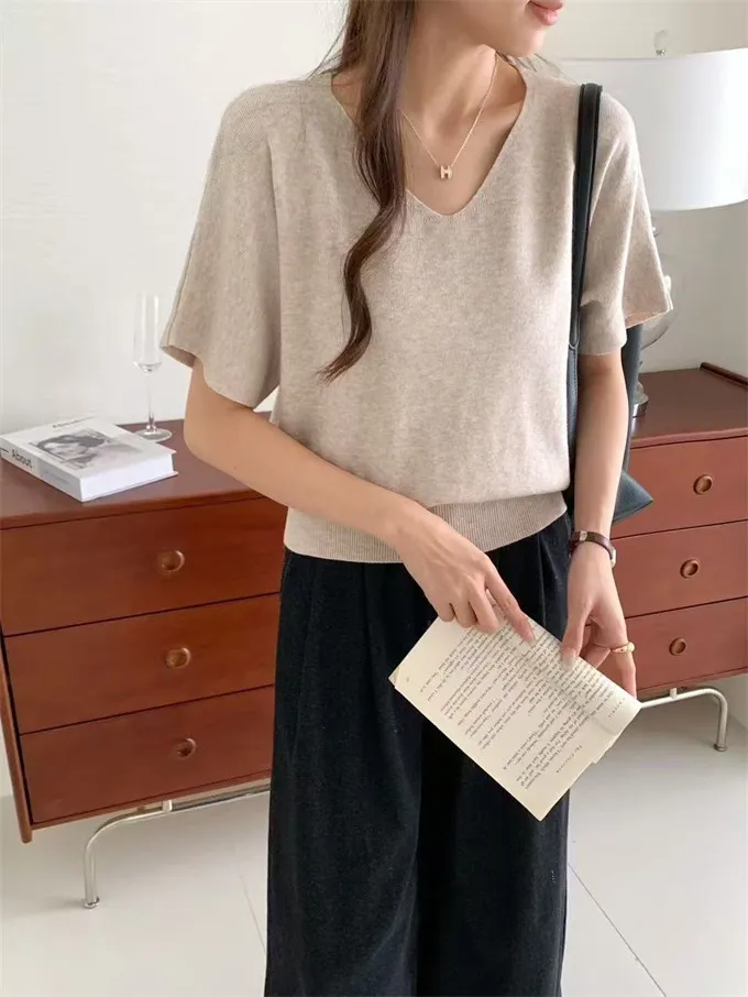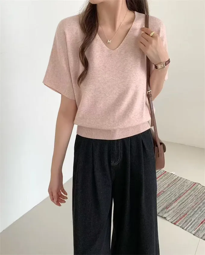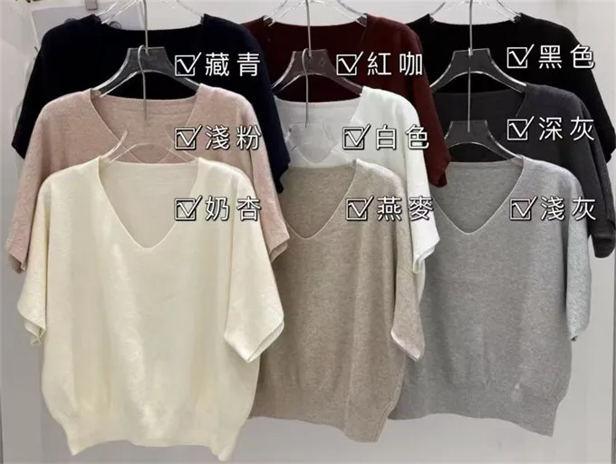 歐膩日常穿搭系軟糯V領短袖針織_A06
