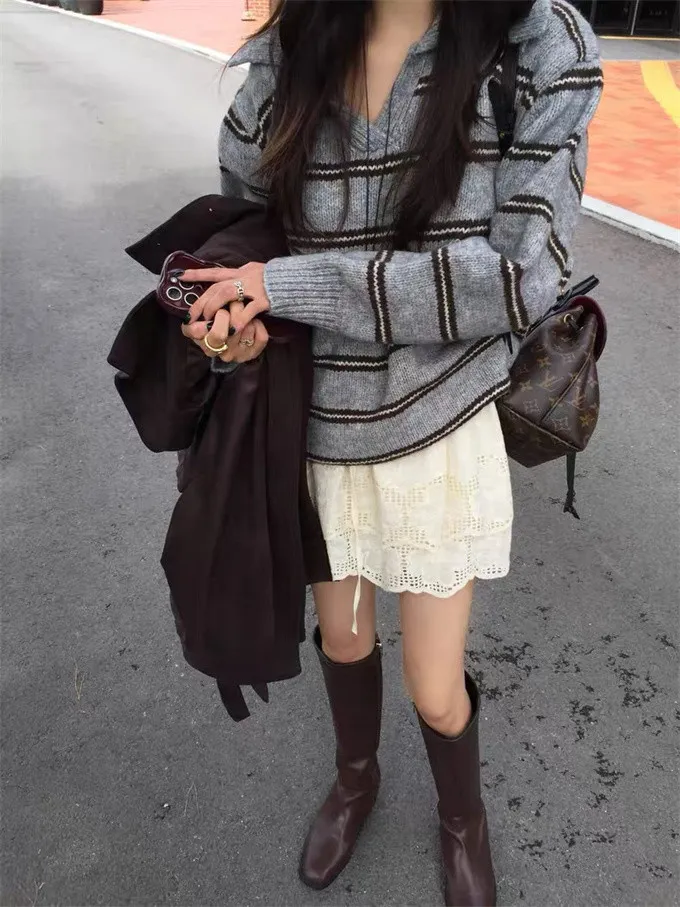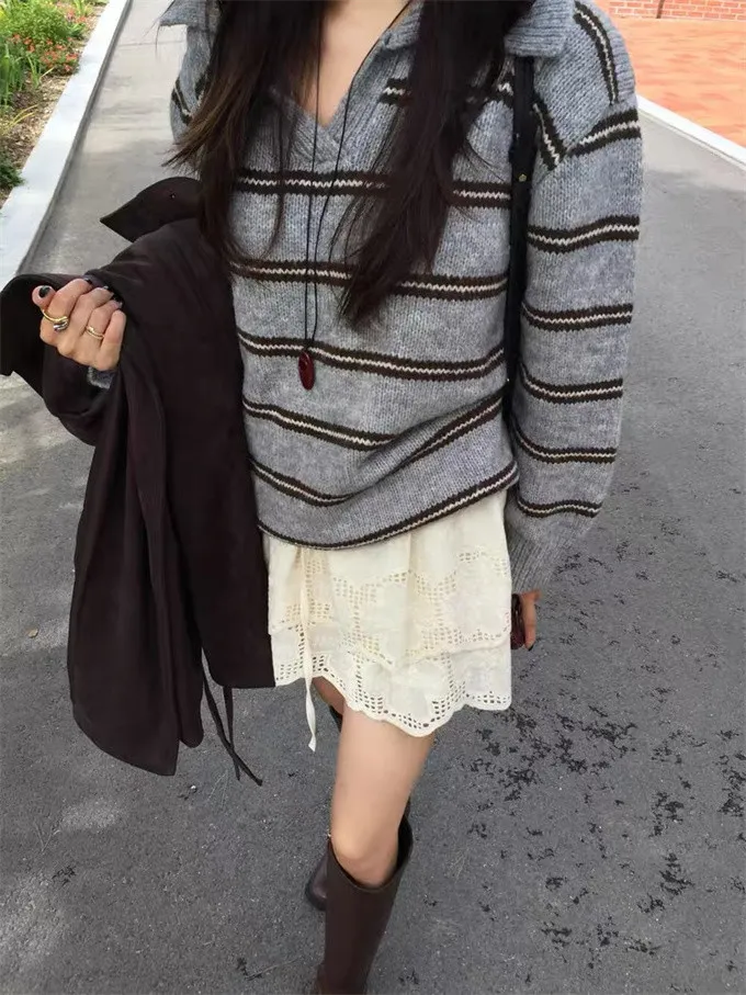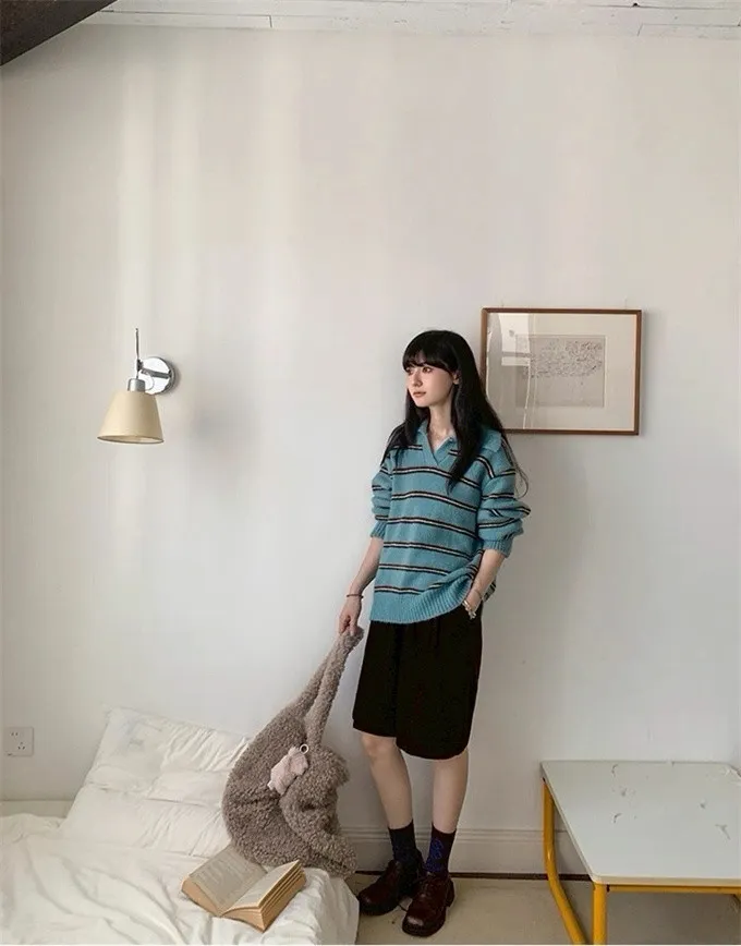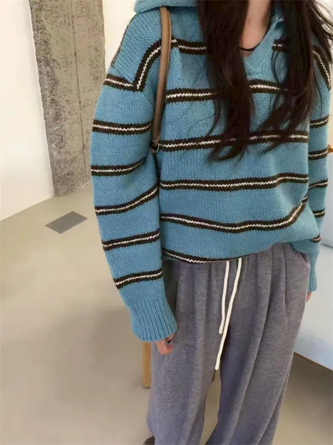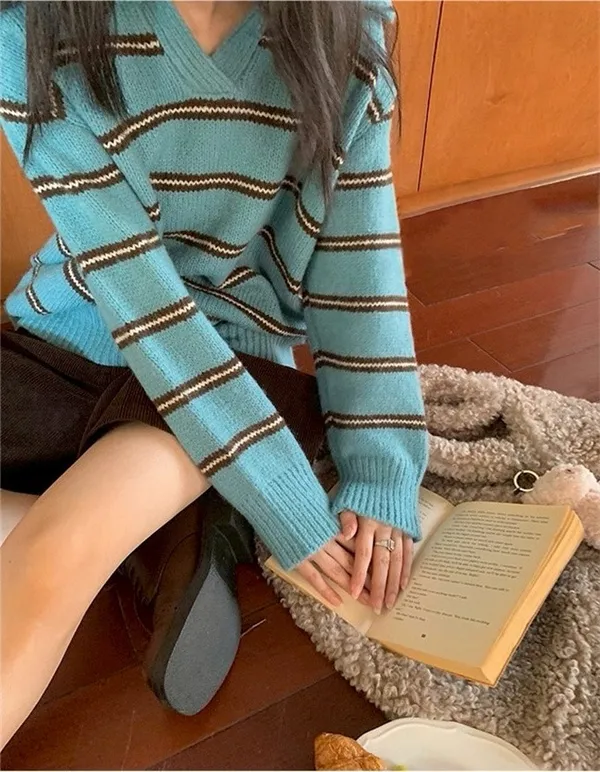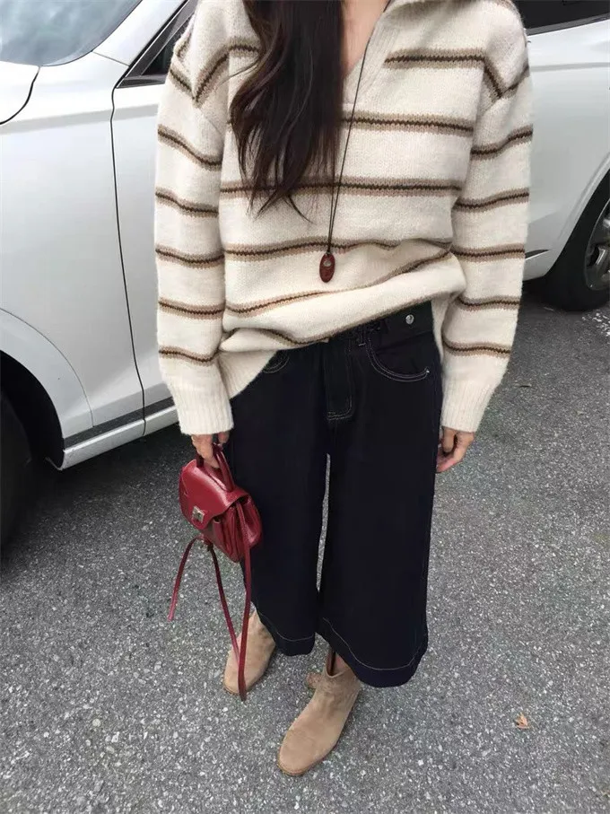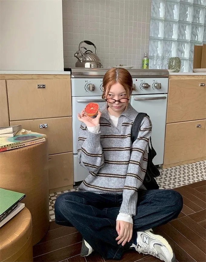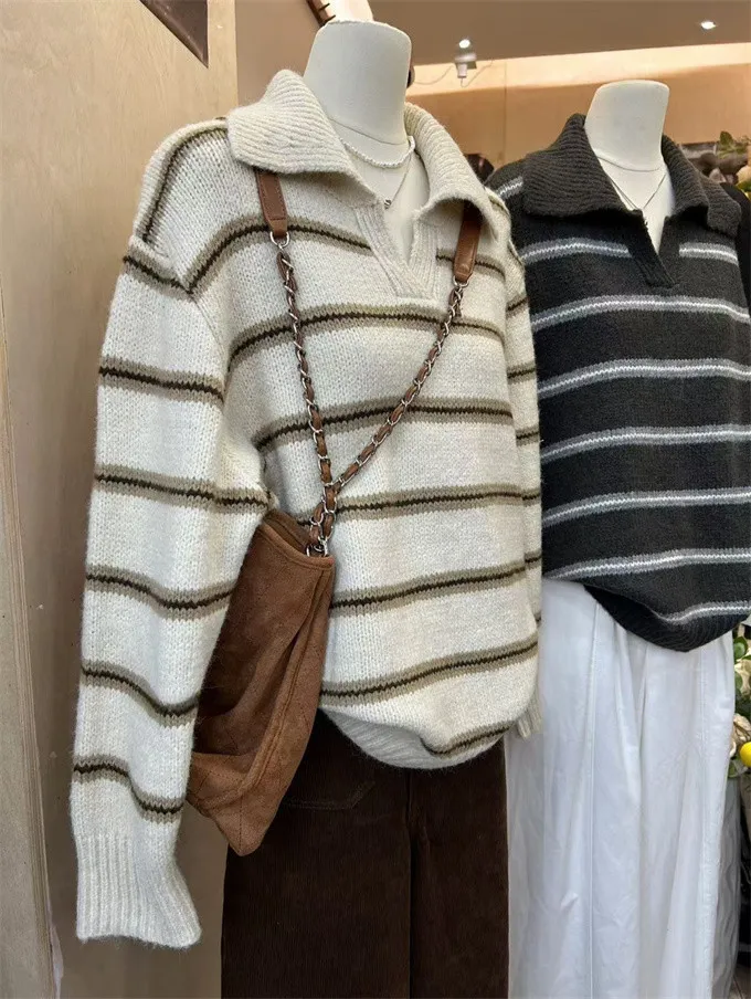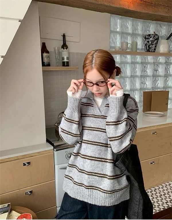 韓系復古開領線條針織上衣_B12