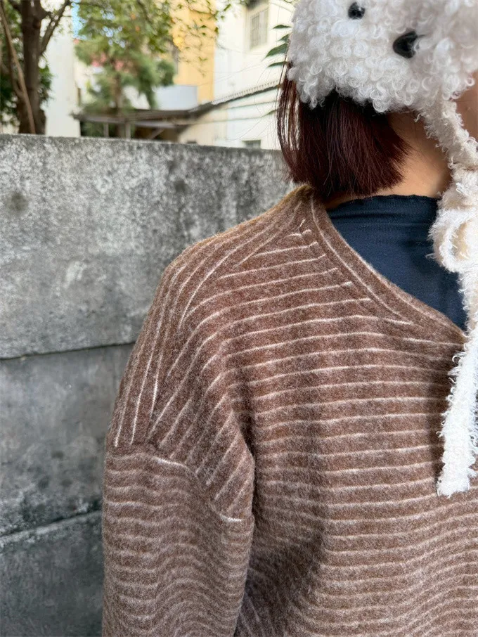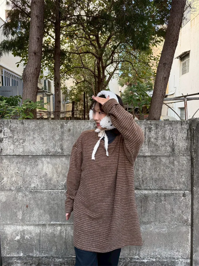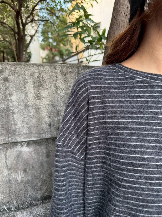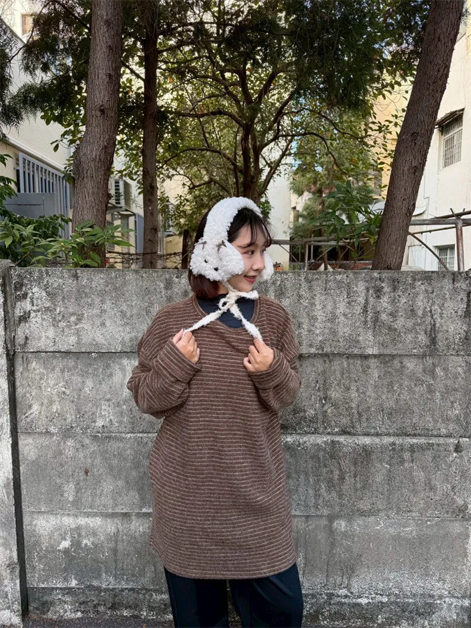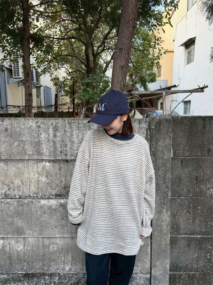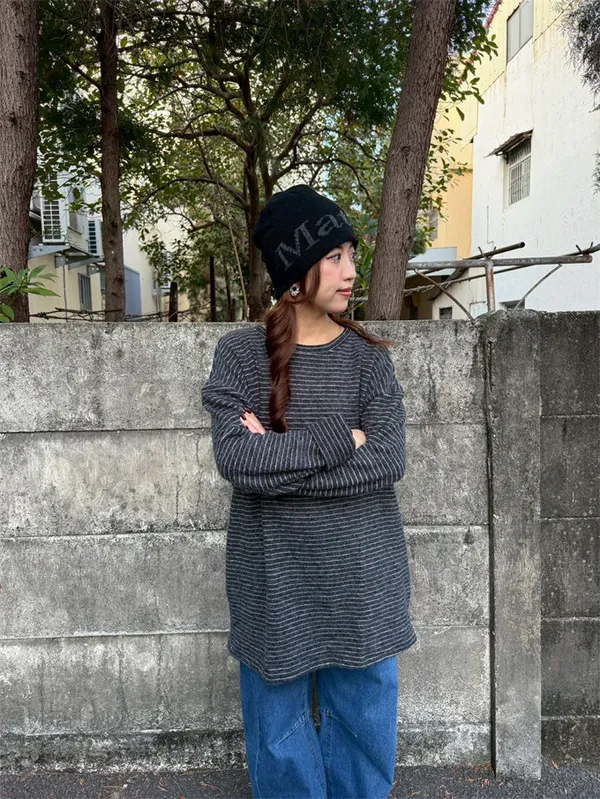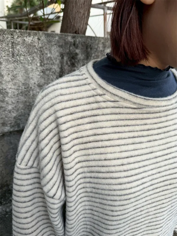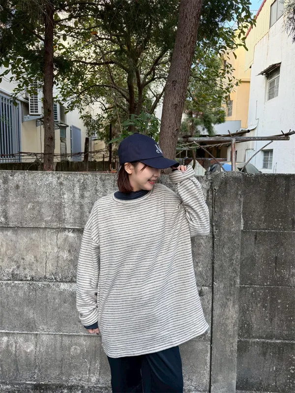 【福利標】慵懶風圓領條紋磨毛彈性上衣_狂