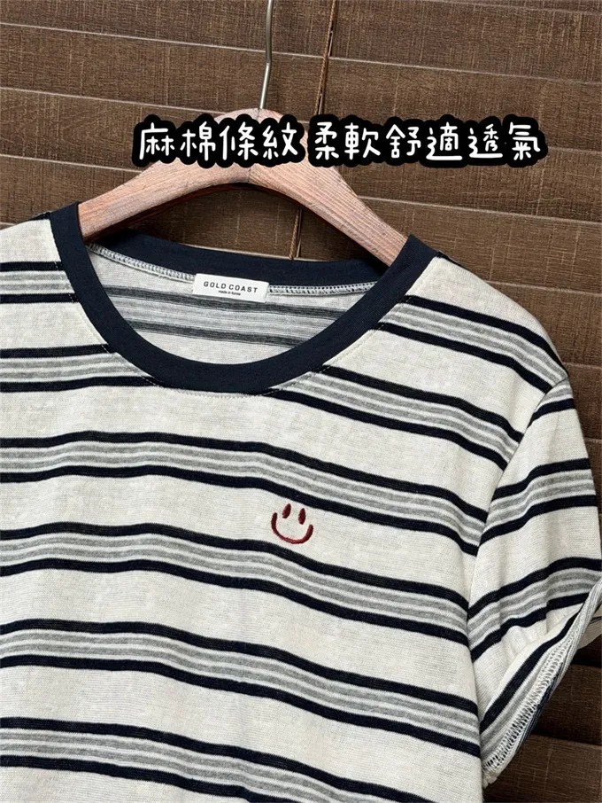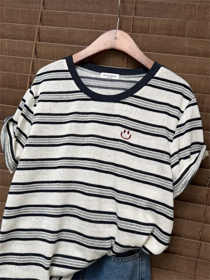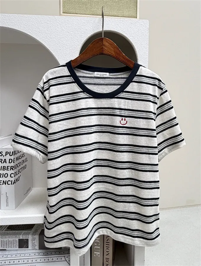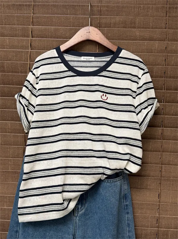 韓國 刺繡笑臉麻棉條紋tee