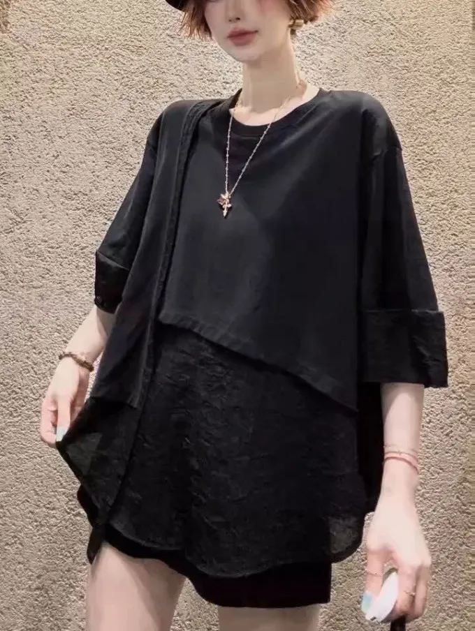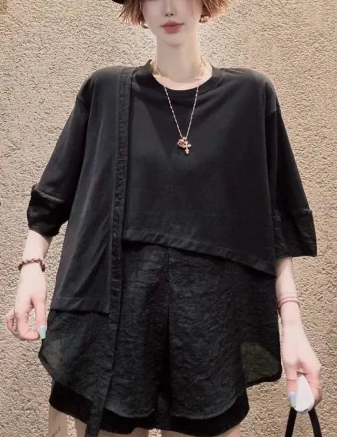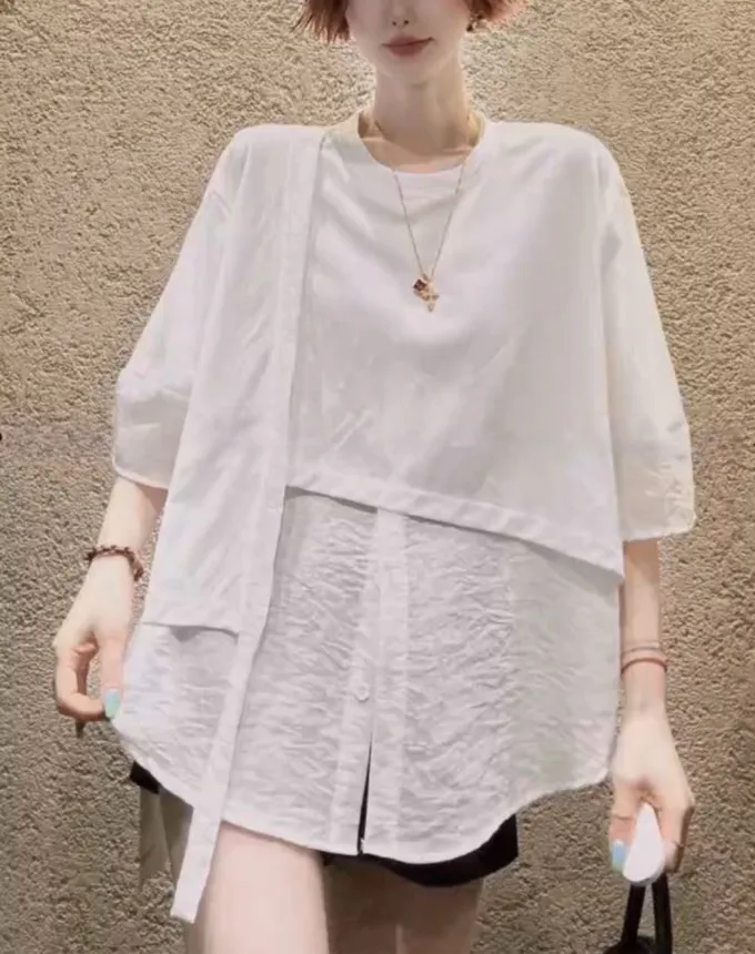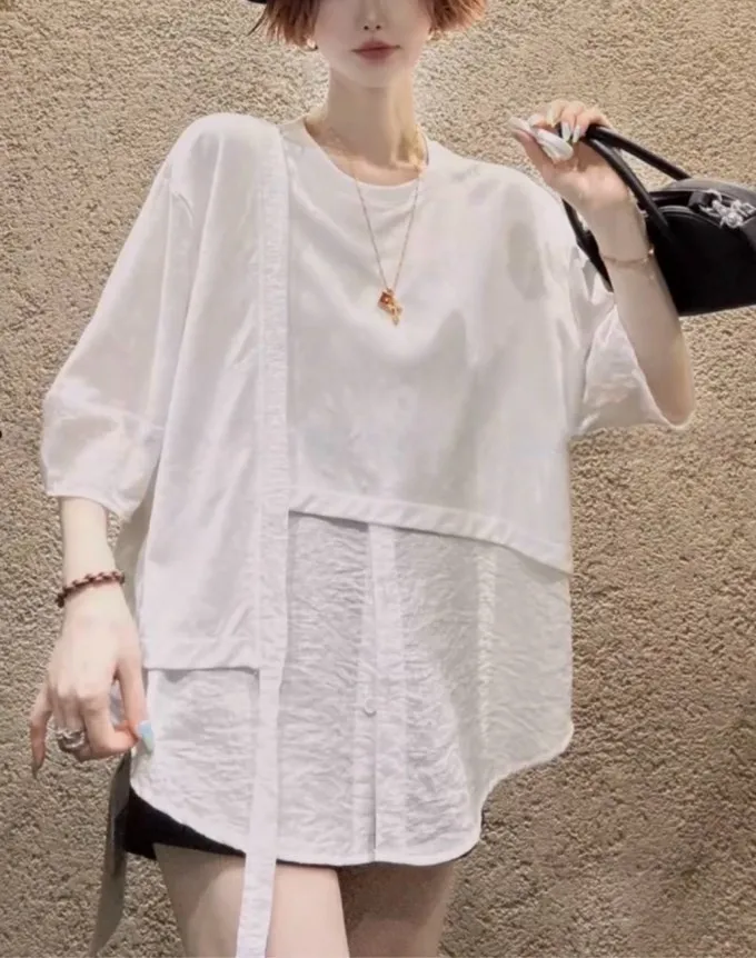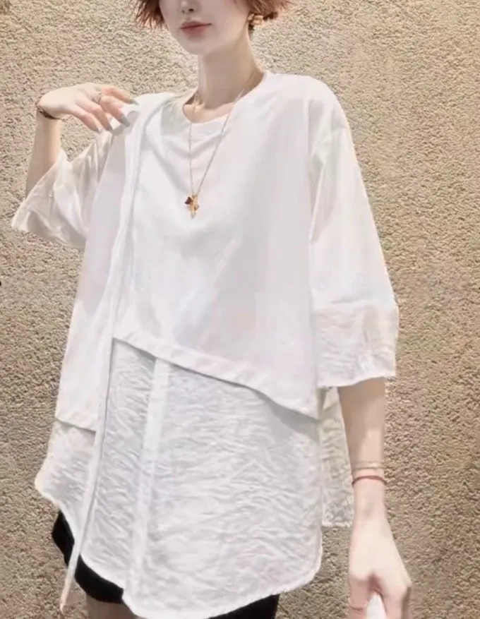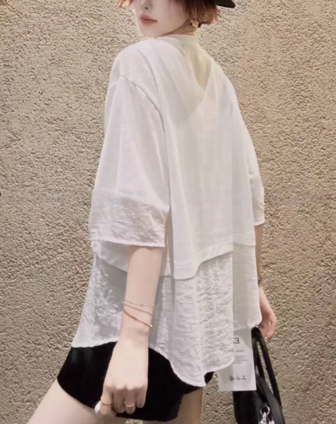 雪紡紗+空氣棉拼接剪裁上衣_G12