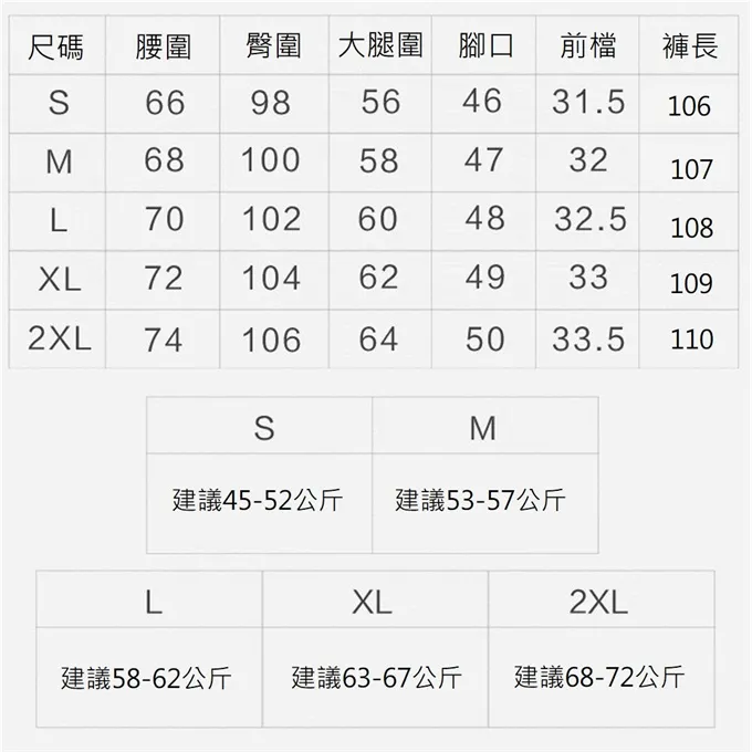 | 尺寸(cm) | 全長 | 腰寬 | 臀寬 | 褲襠 | 大腿寬 |