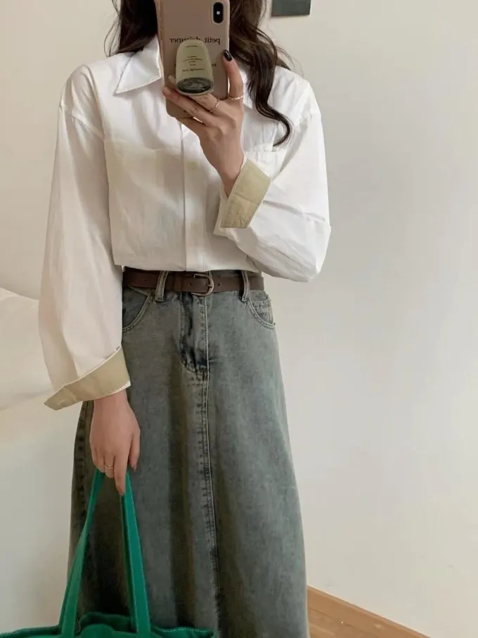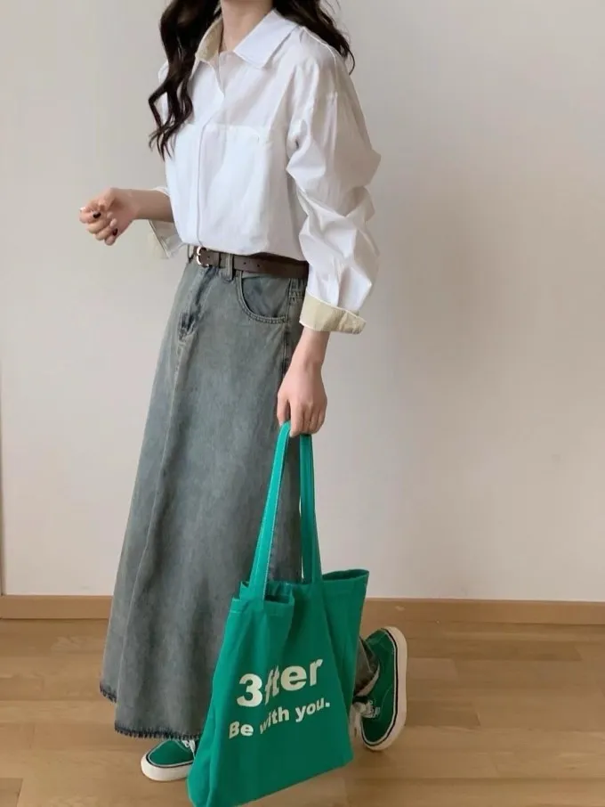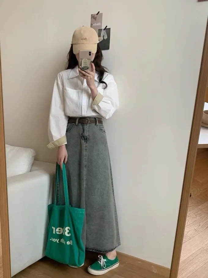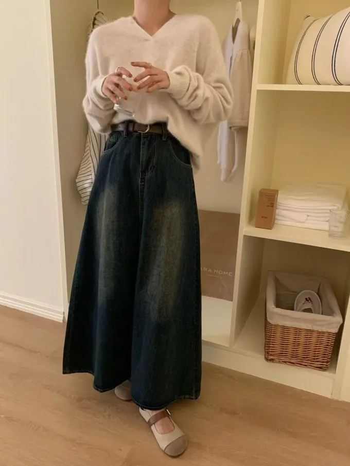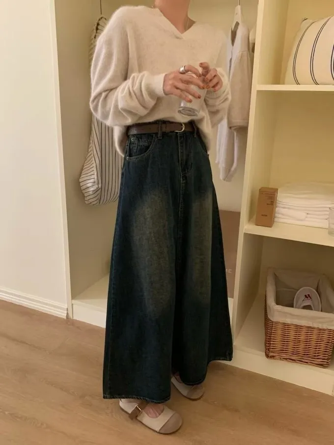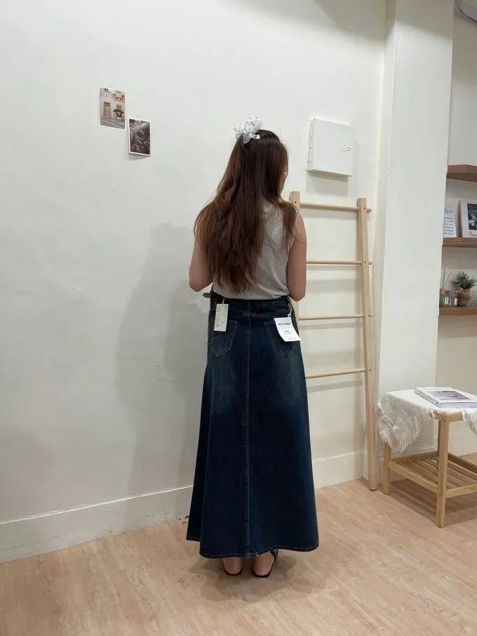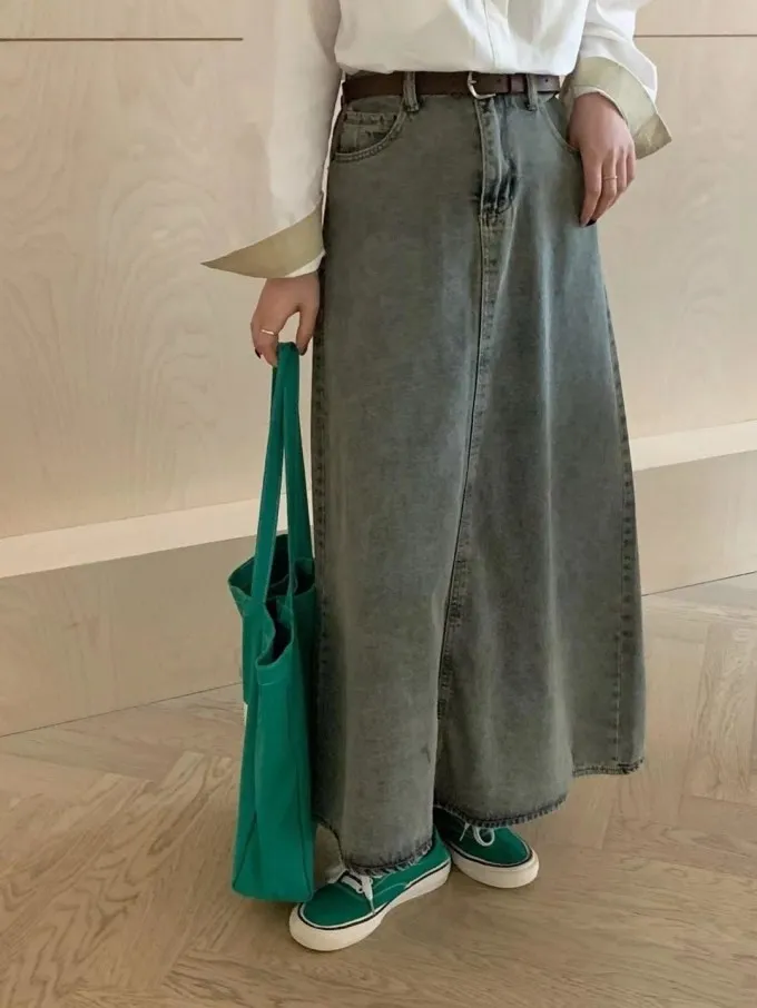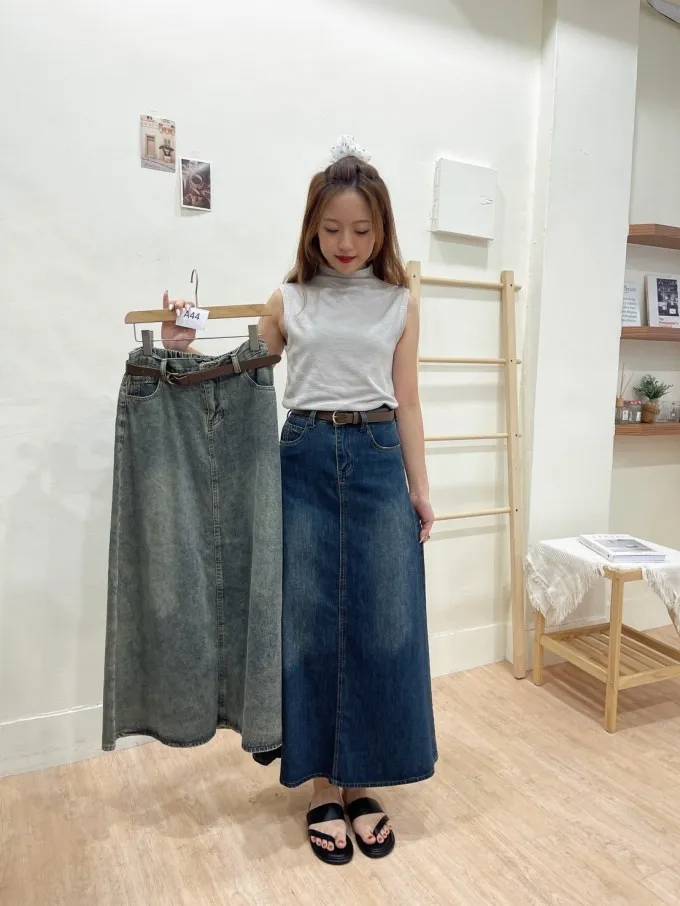 復古感牛仔傘裙附皮帶_A44