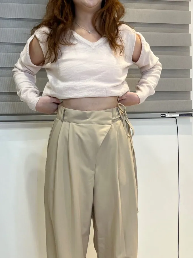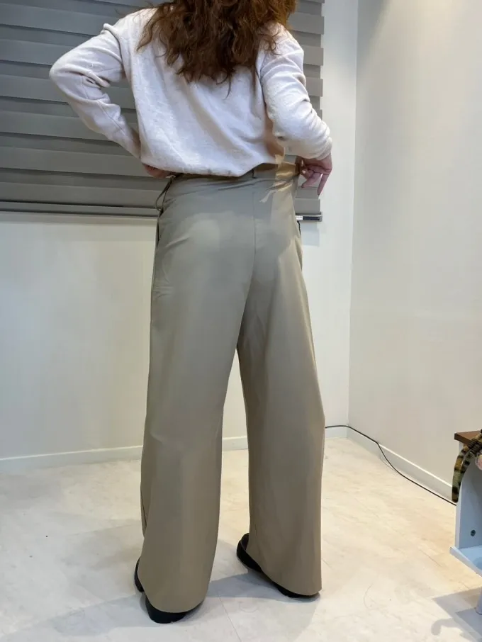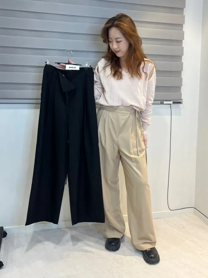 韓國 韓國 特色腰帶綁袋闊腿西裝褲_H69