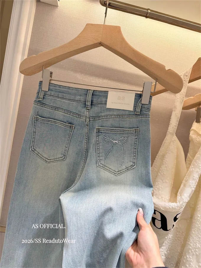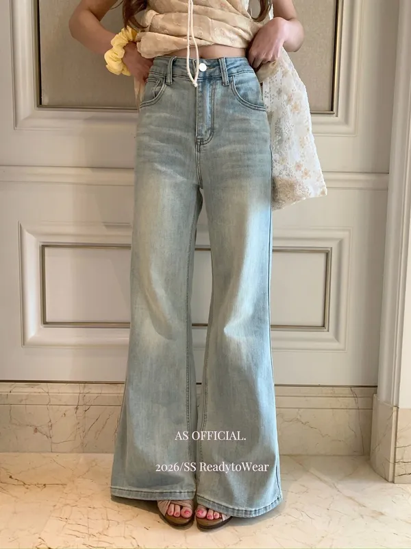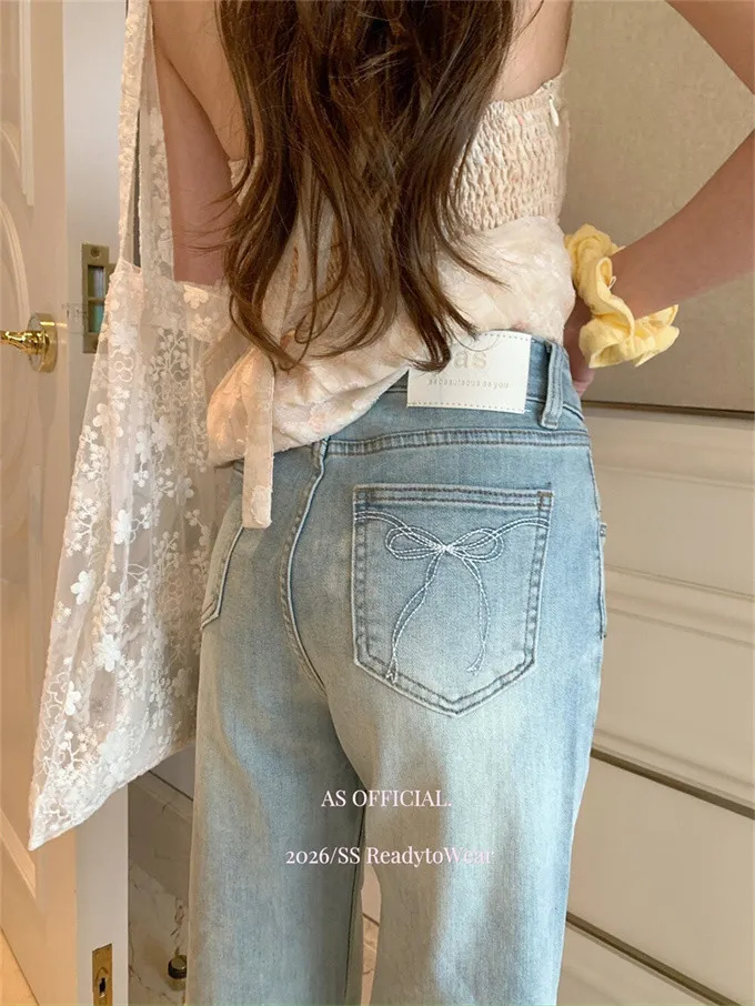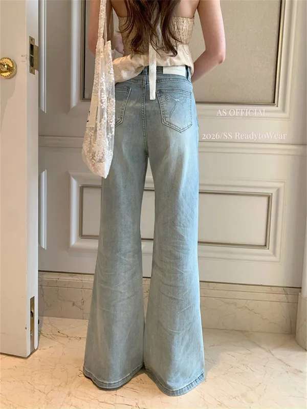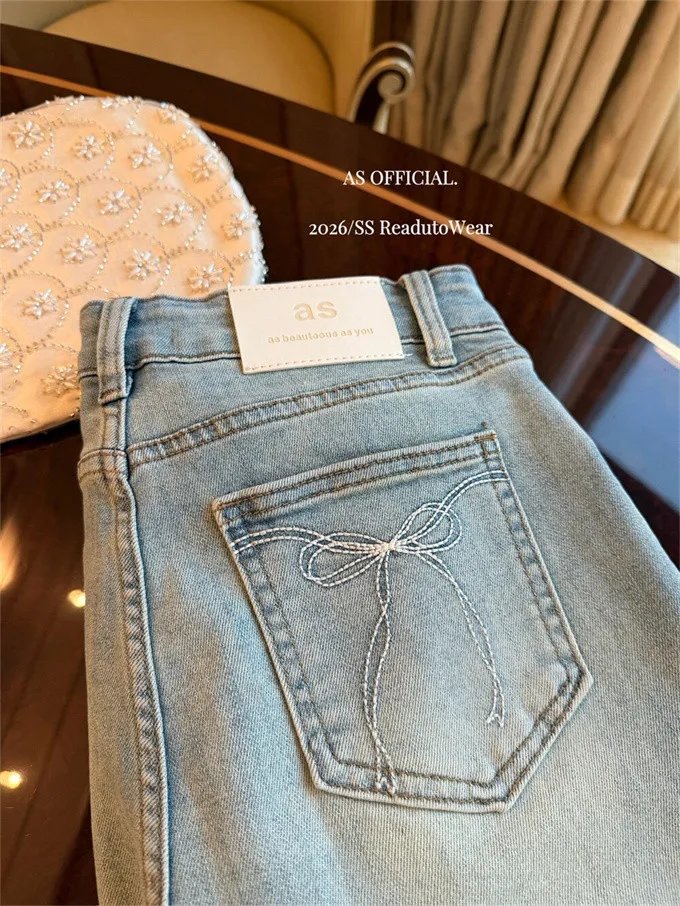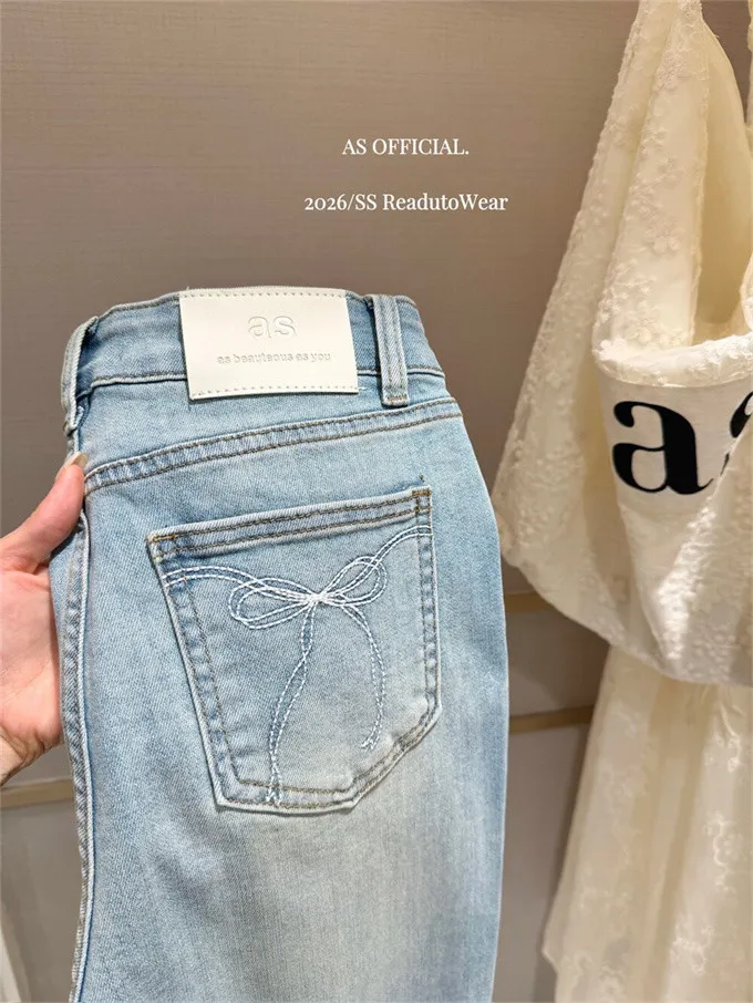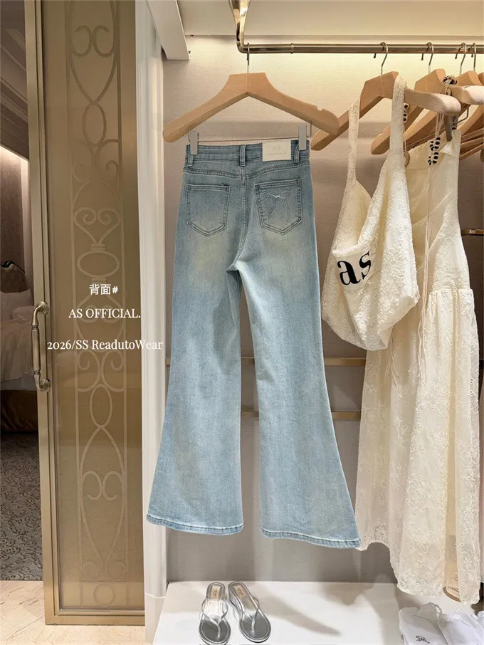 瘦腿標竿後刺繡水洗微喇牛仔褲_A03