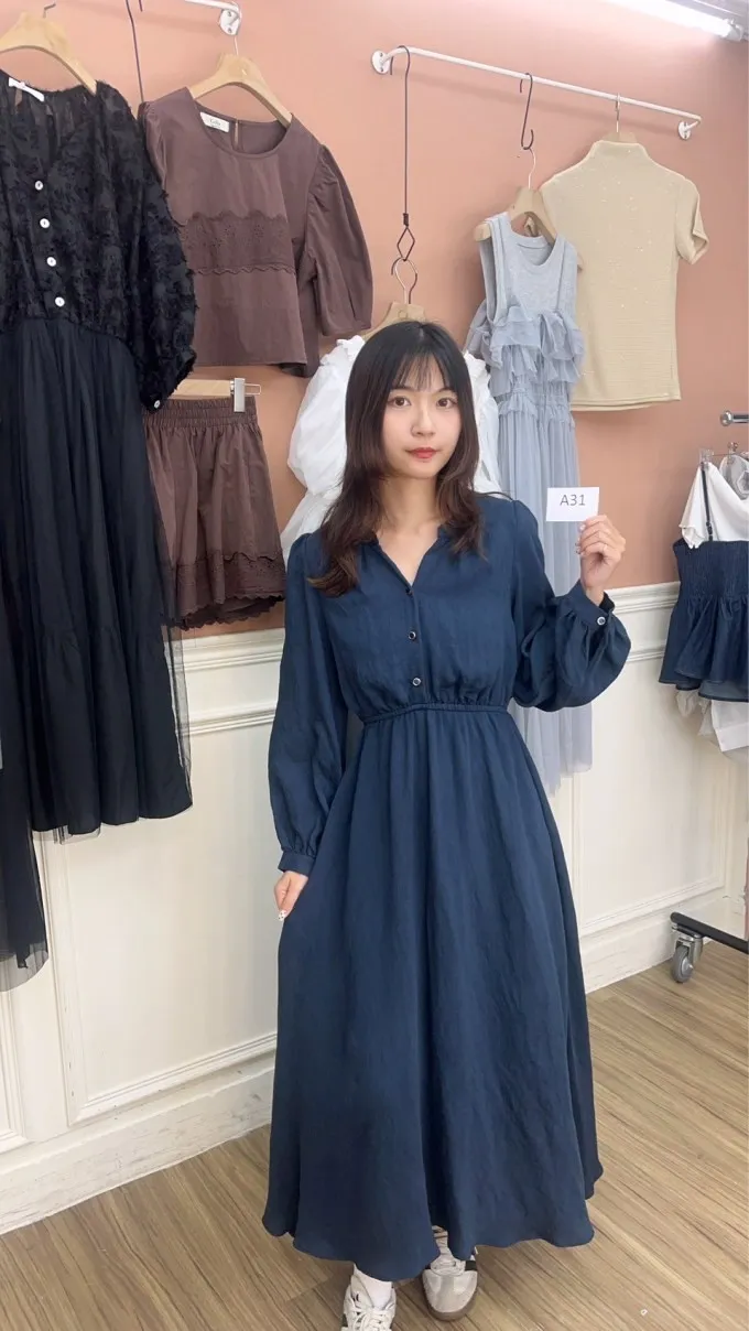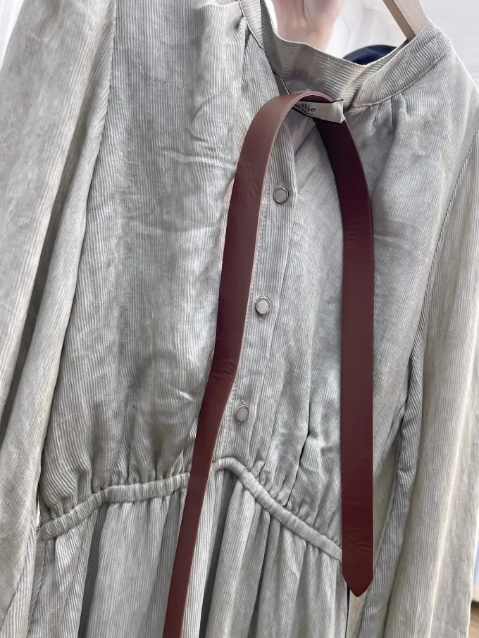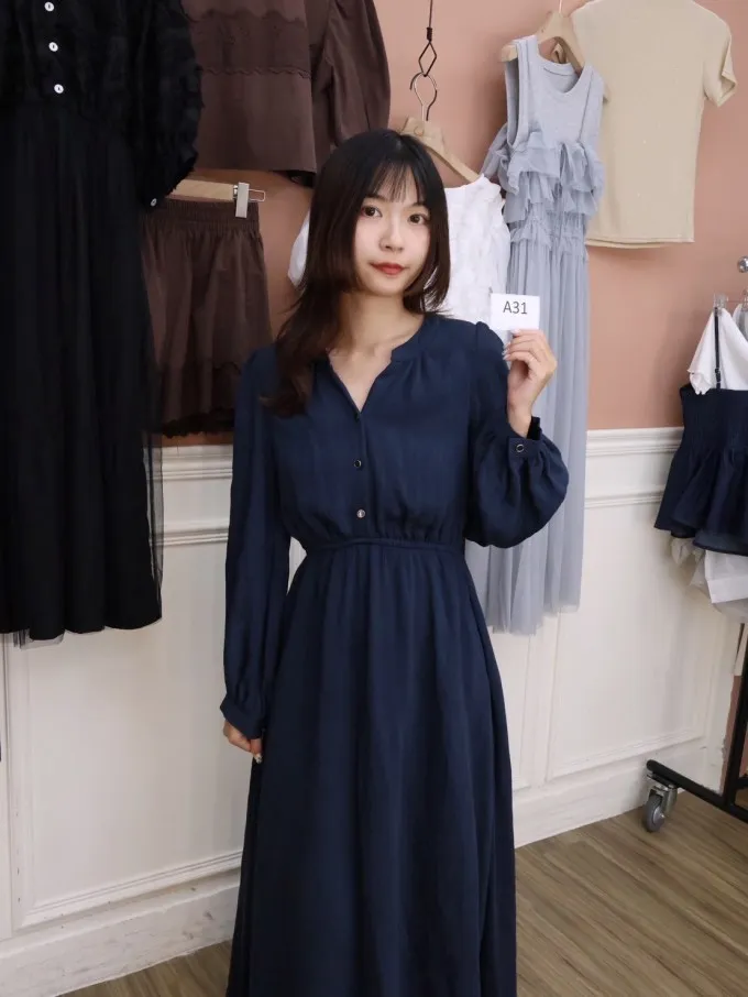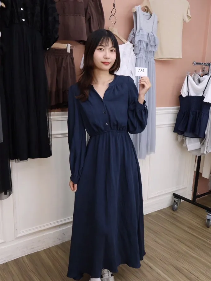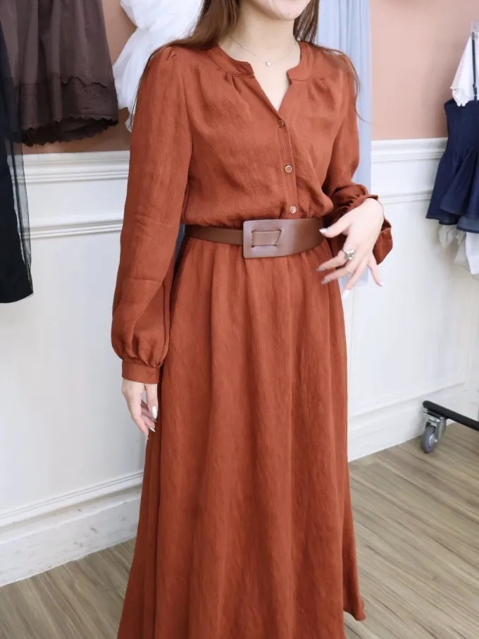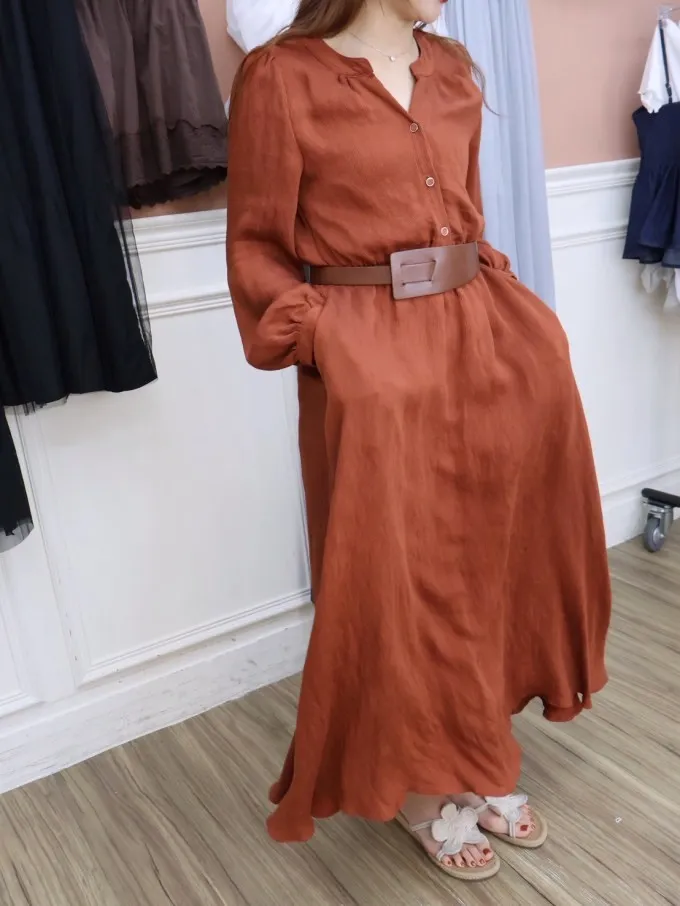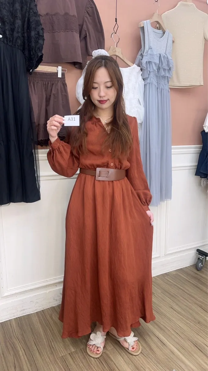 開襟排釦縮腰長洋(附腰帶/有口袋)_A31