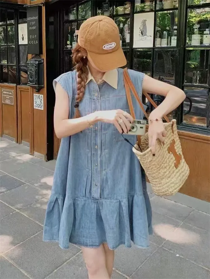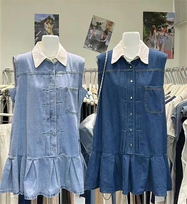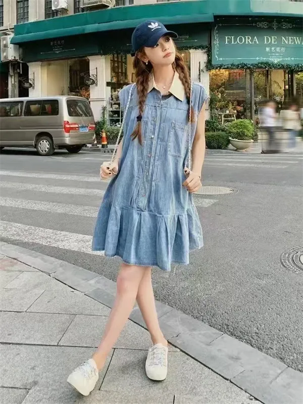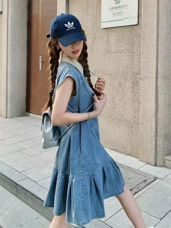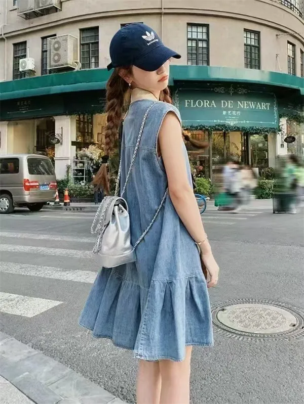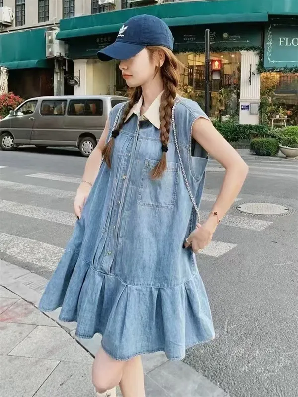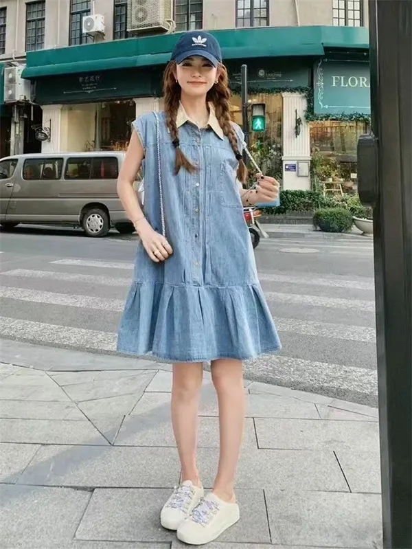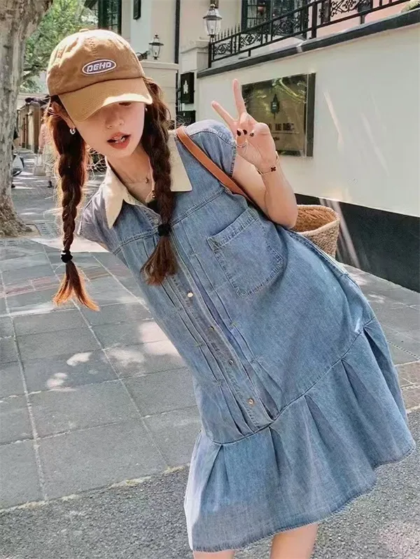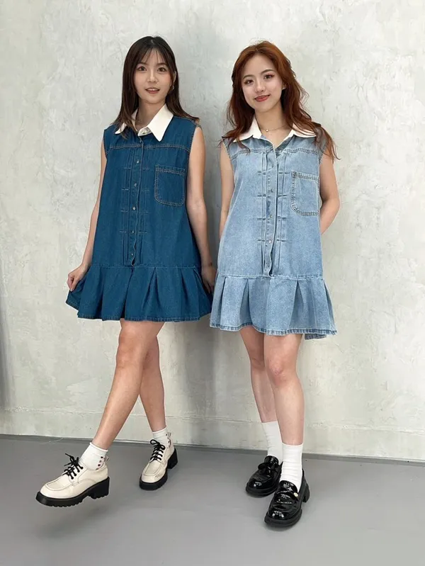 可愛白領排釦牛仔魚尾短裙_B22