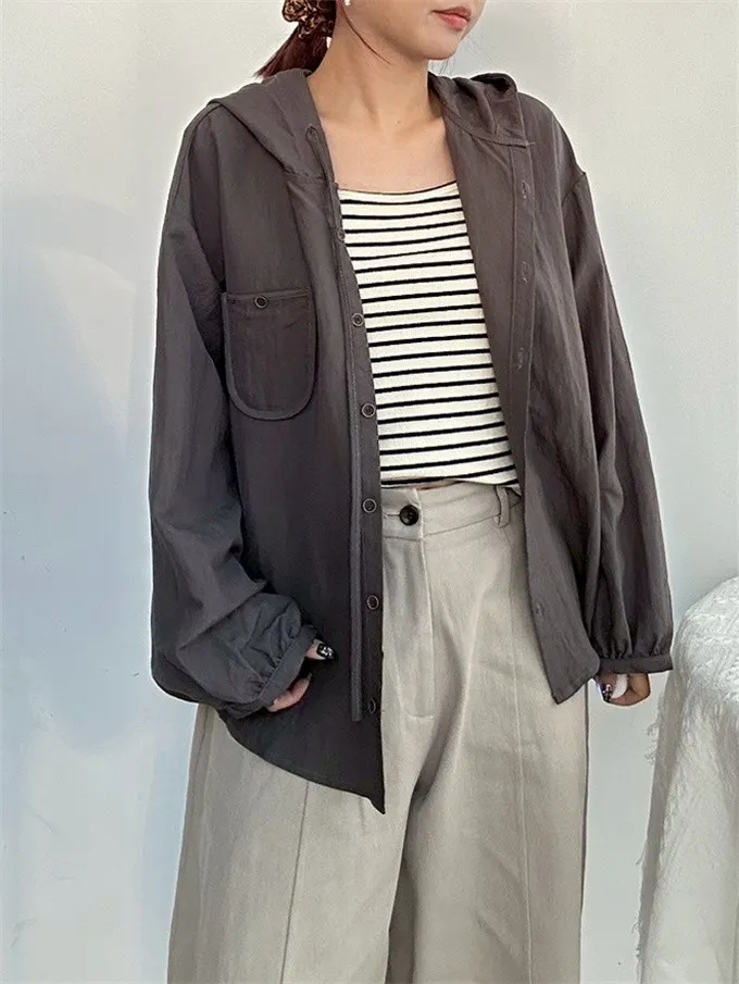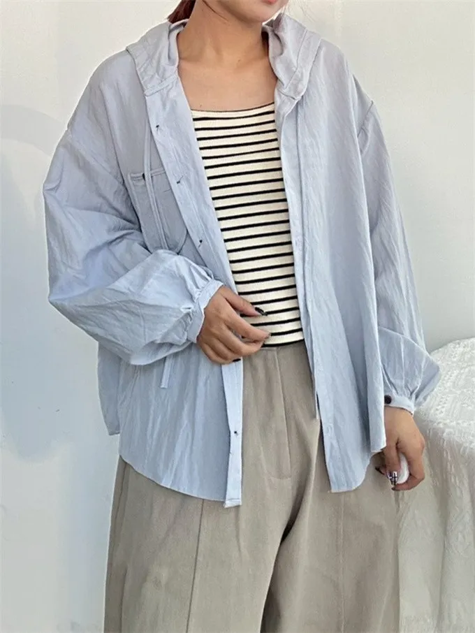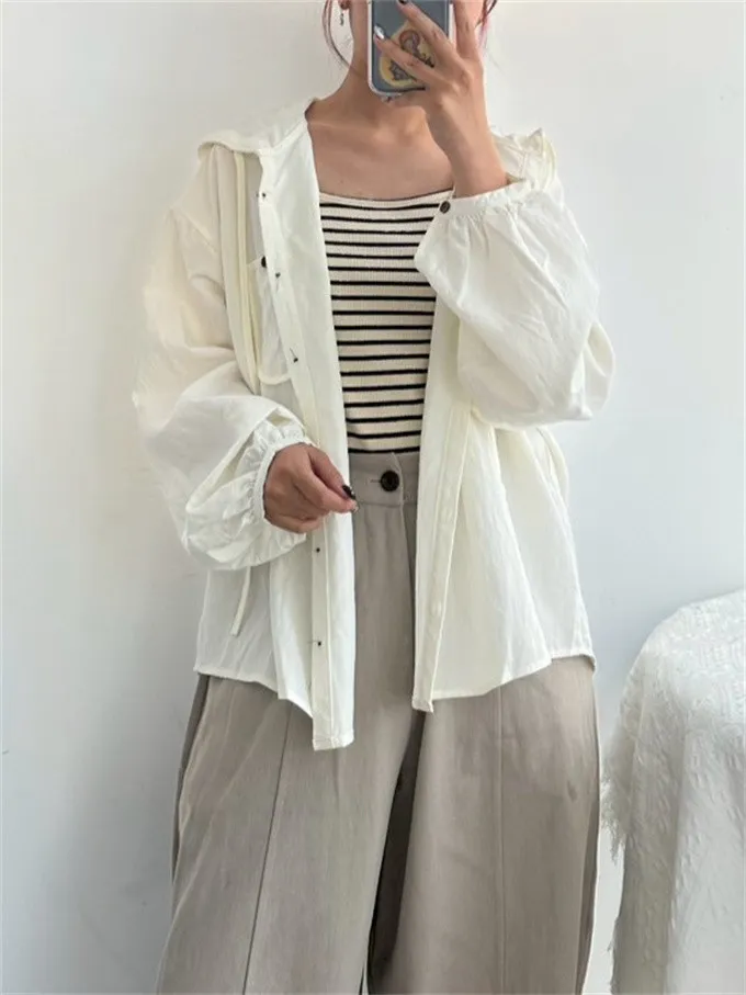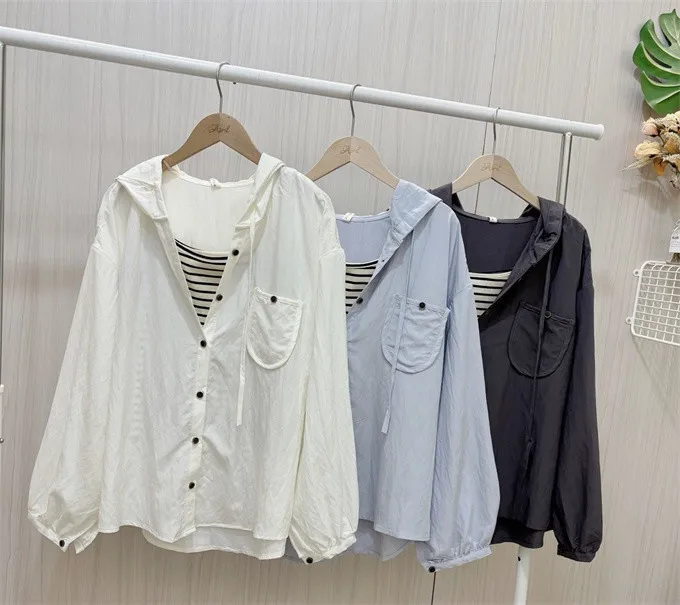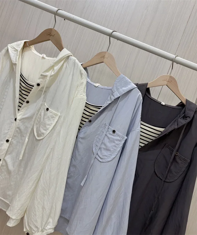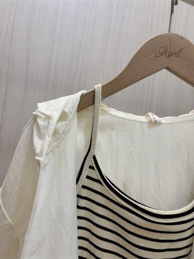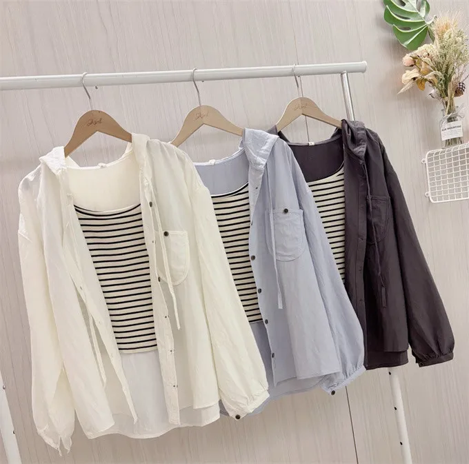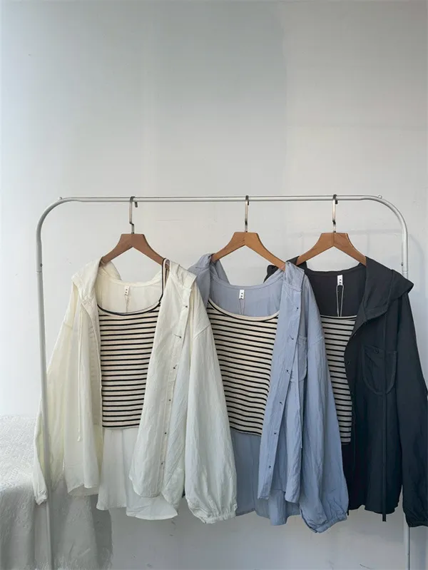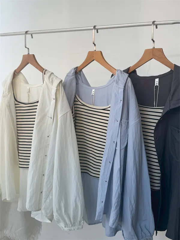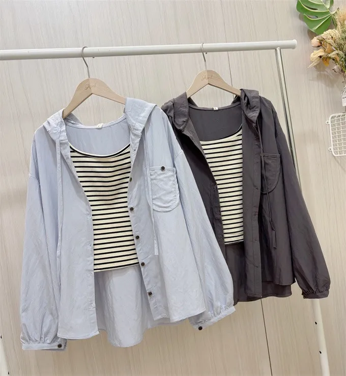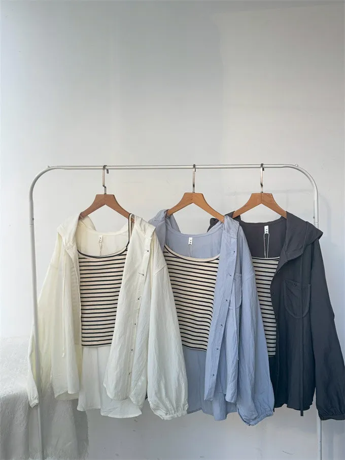 【層次日常連帽襯衫+條紋背心套裝】