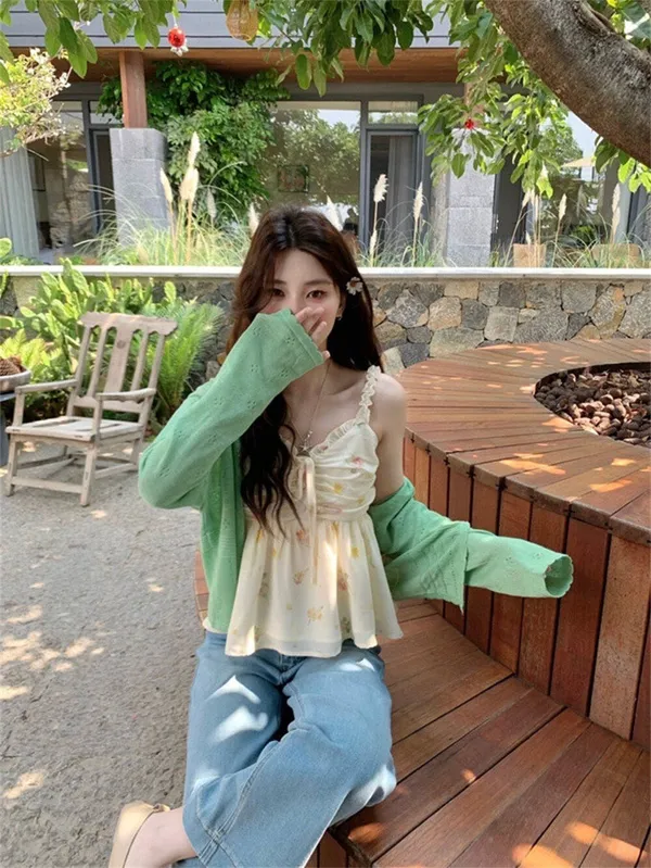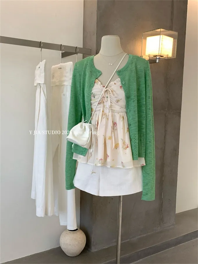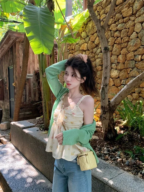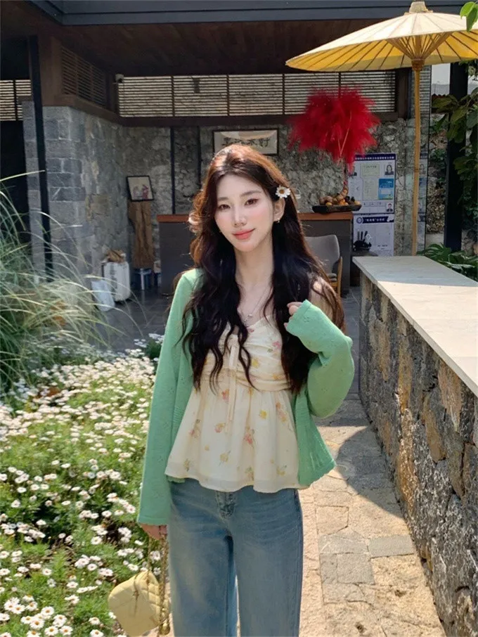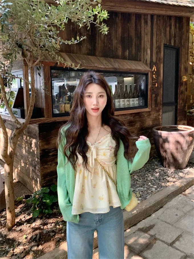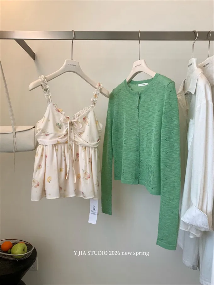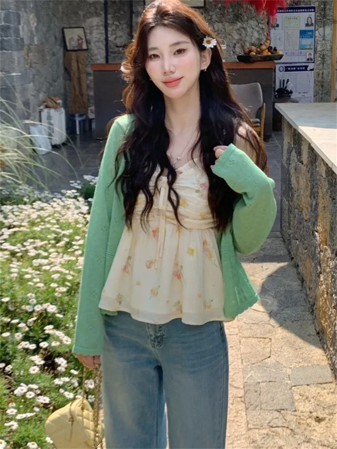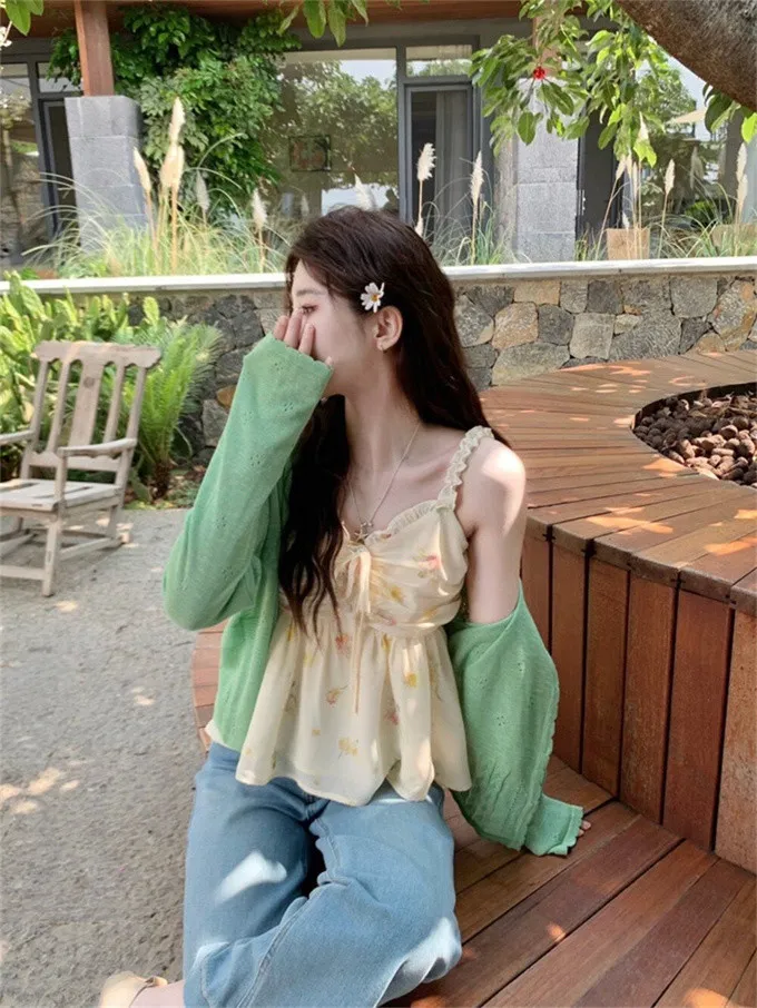 鏤空針織衫+碎花木耳邊吊帶套裝_A01