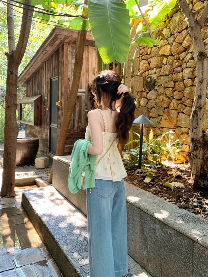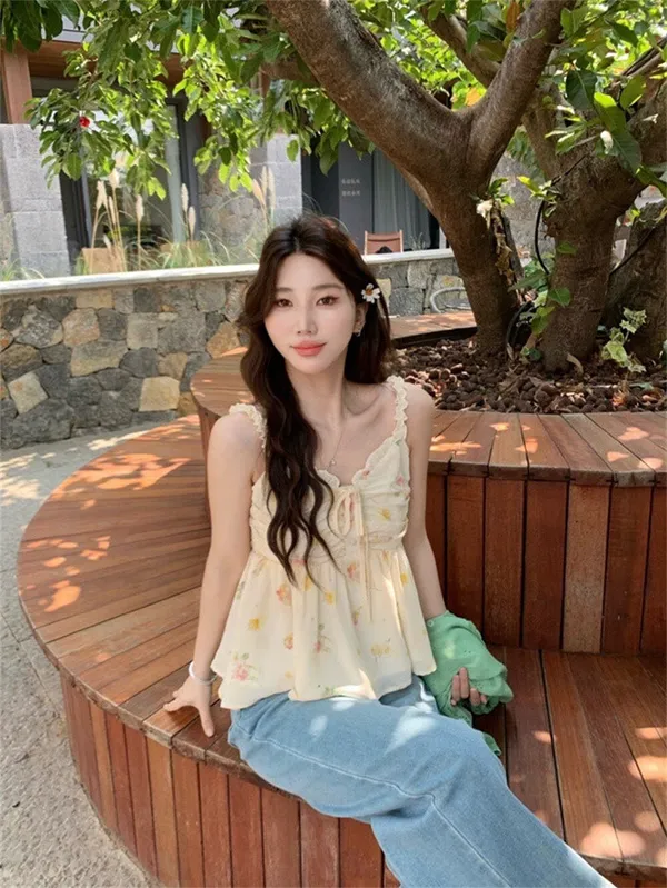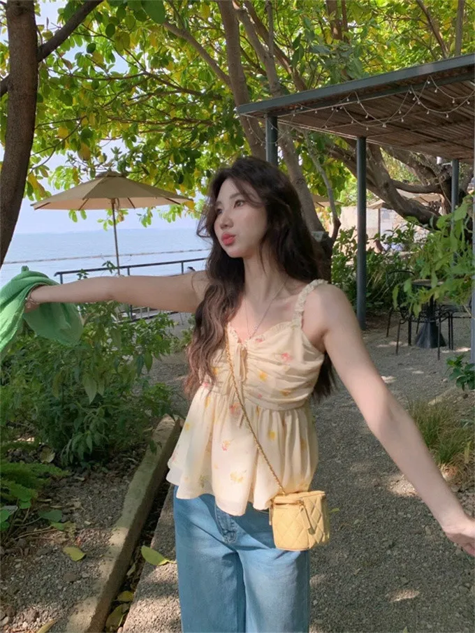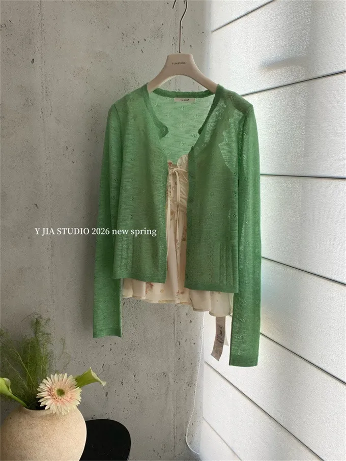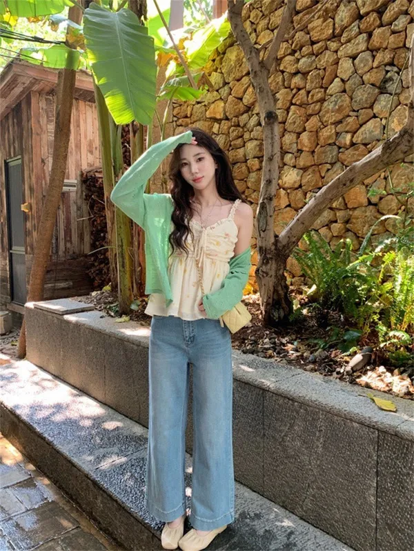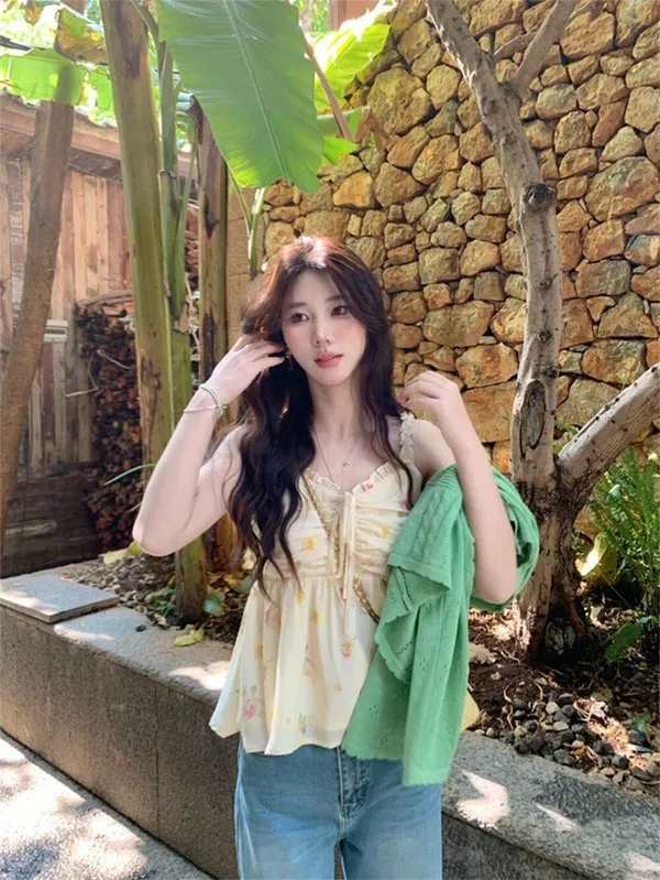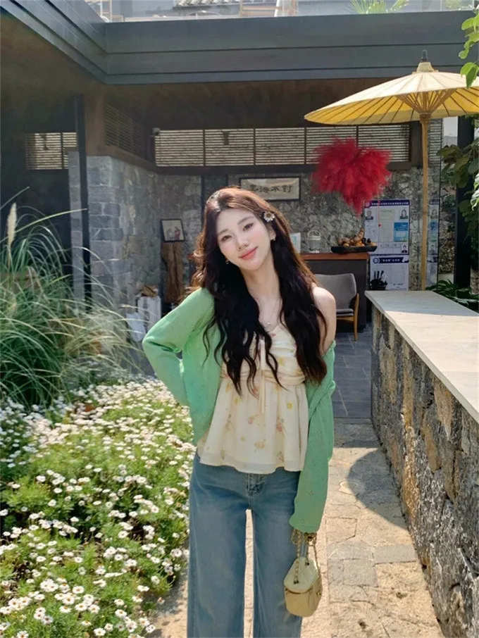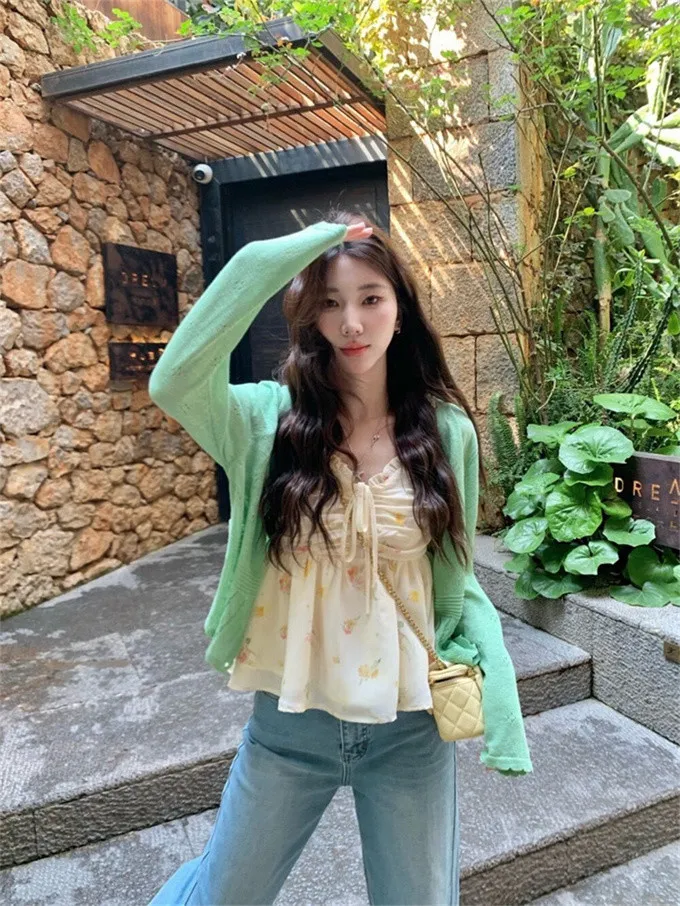 鏤空針織衫+碎花木耳邊吊帶套裝_A01