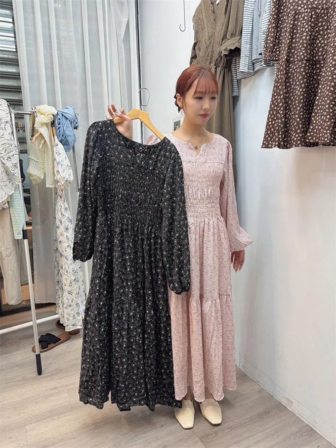 氣質收腰碎花伸縮長洋(S-XL可穿、有口袋)_E12