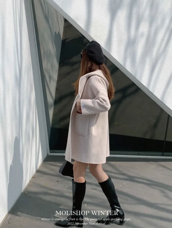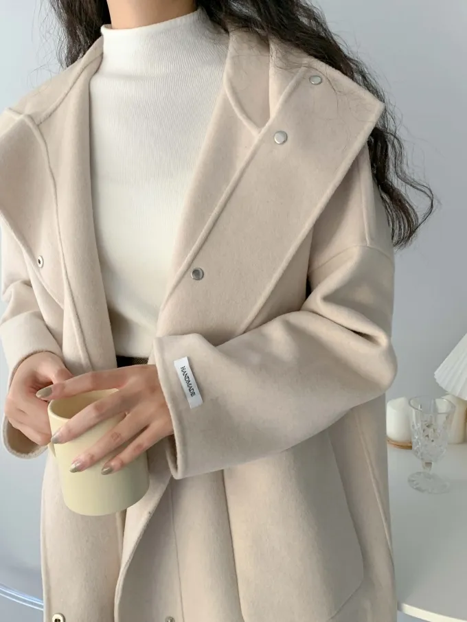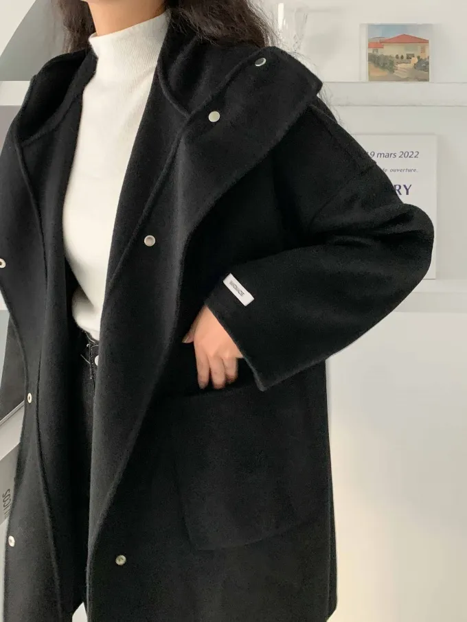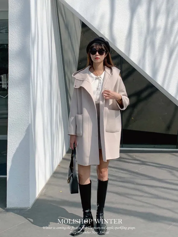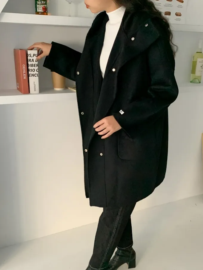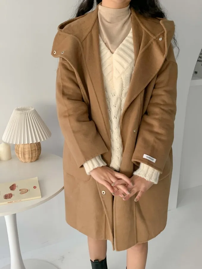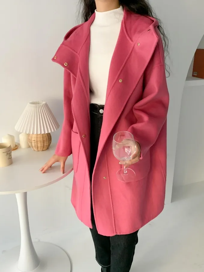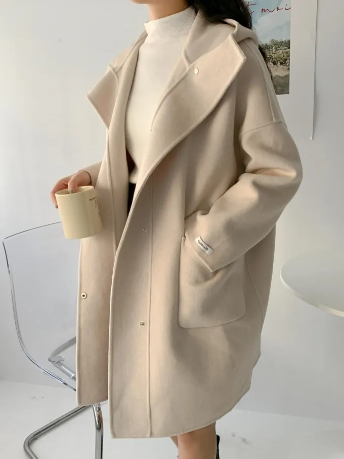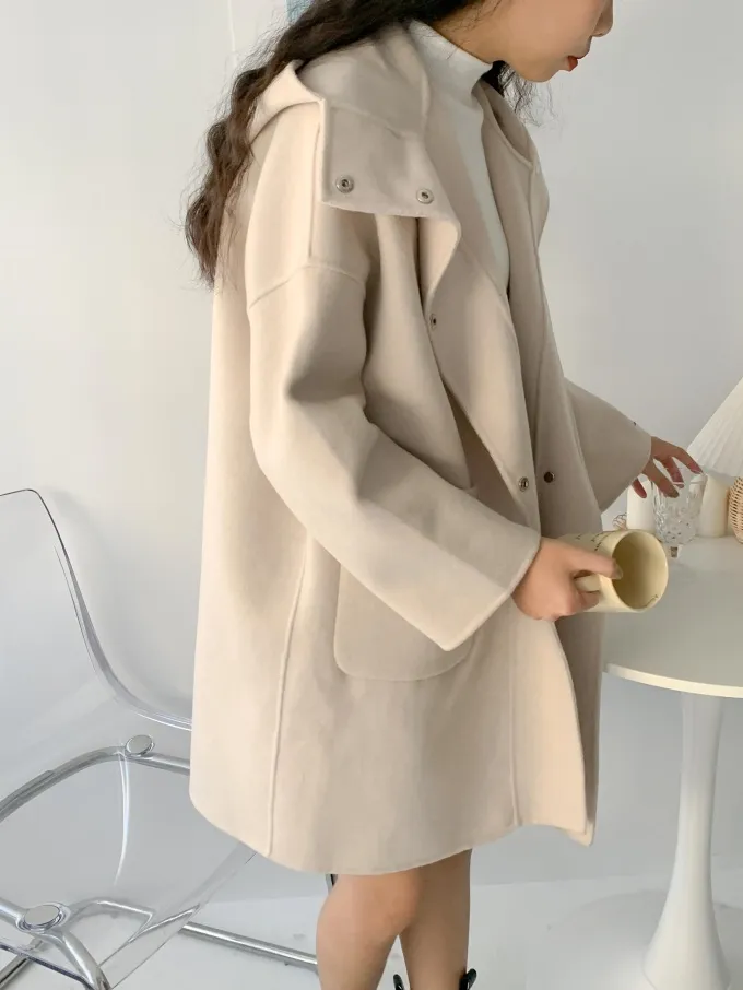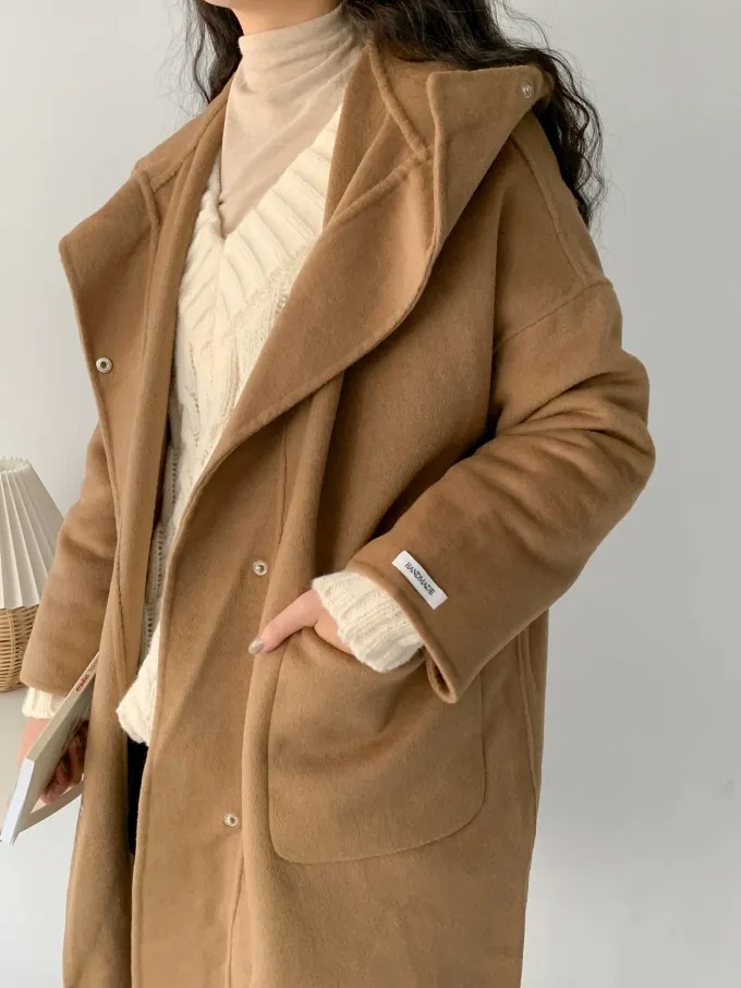 【福利標】雙面100%羊毛寬鬆連帽軟毛呢中長版大衣外套_B16