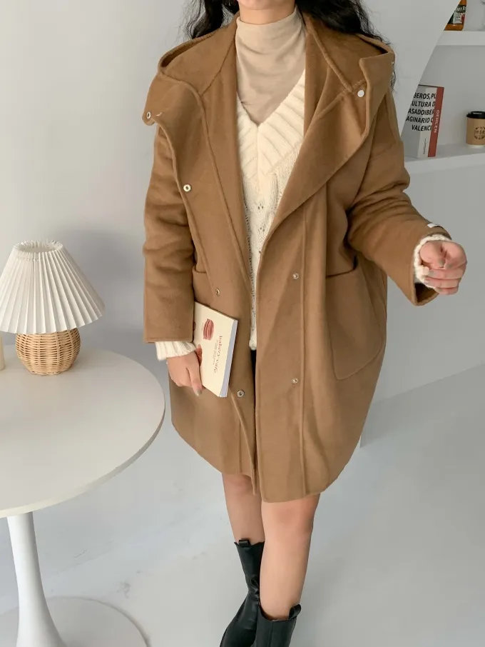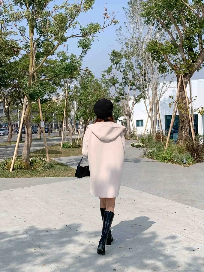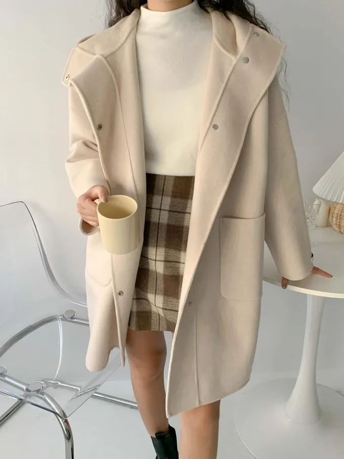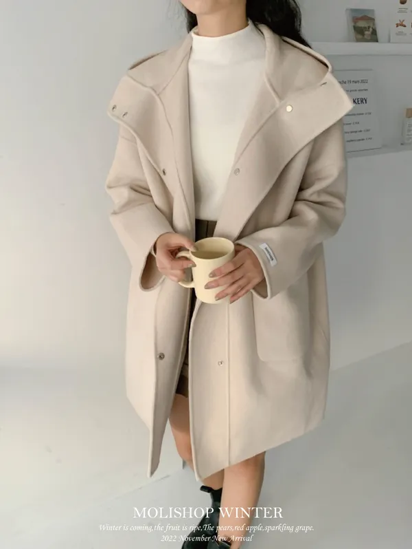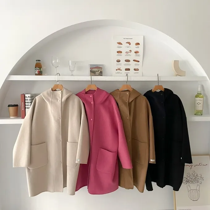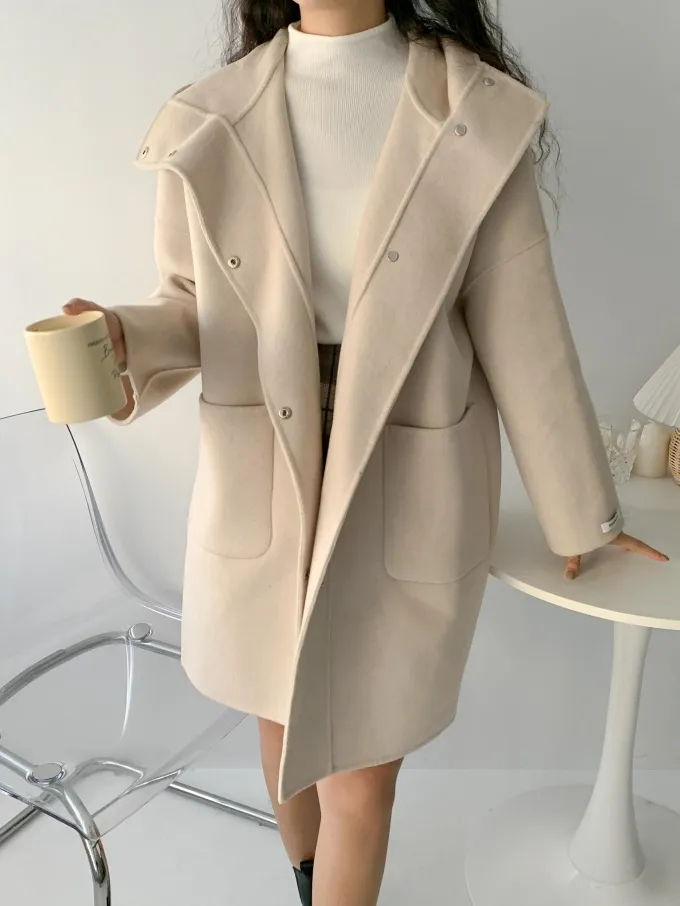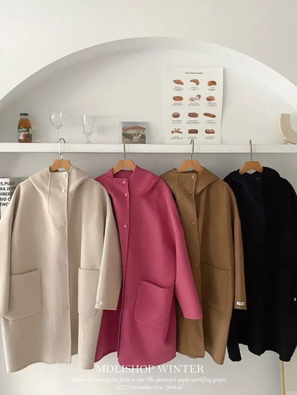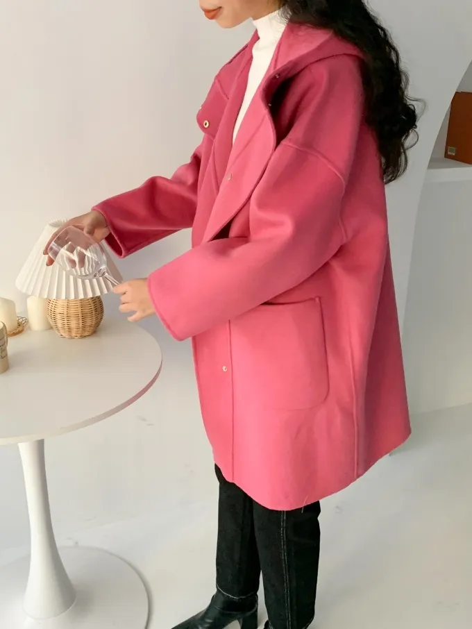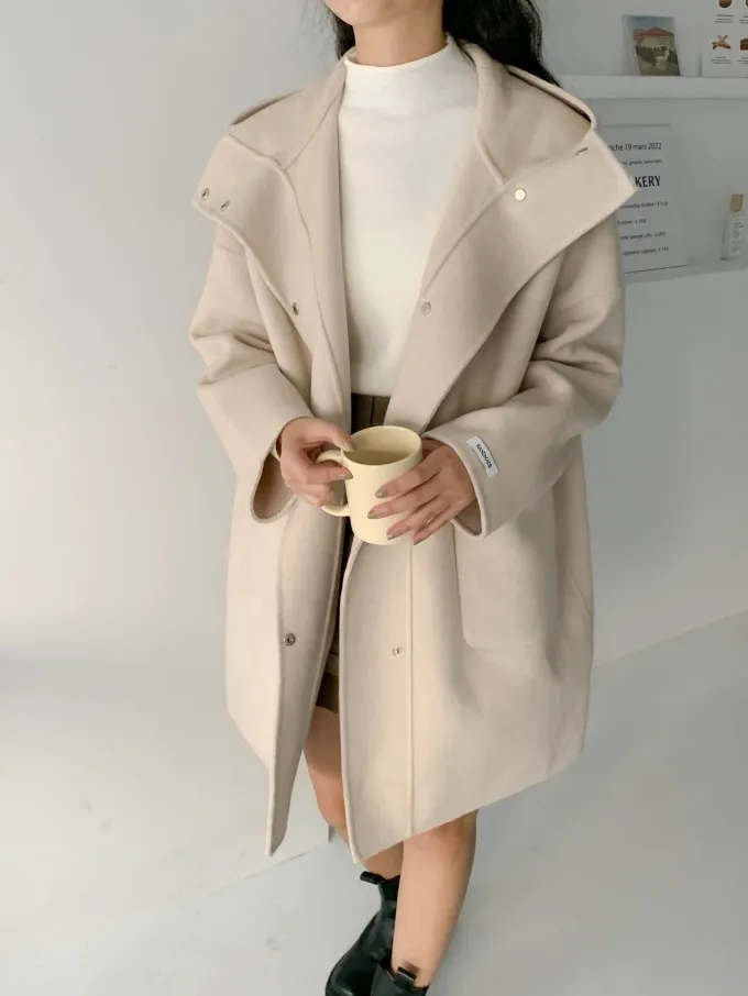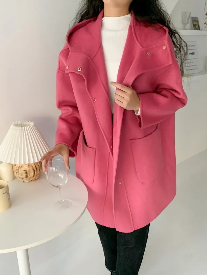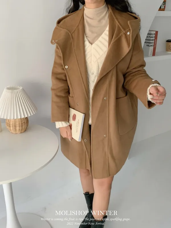 【福利標】雙面100%羊毛寬鬆連帽軟毛呢中長版大衣外套_B16