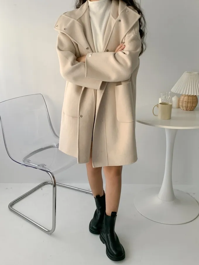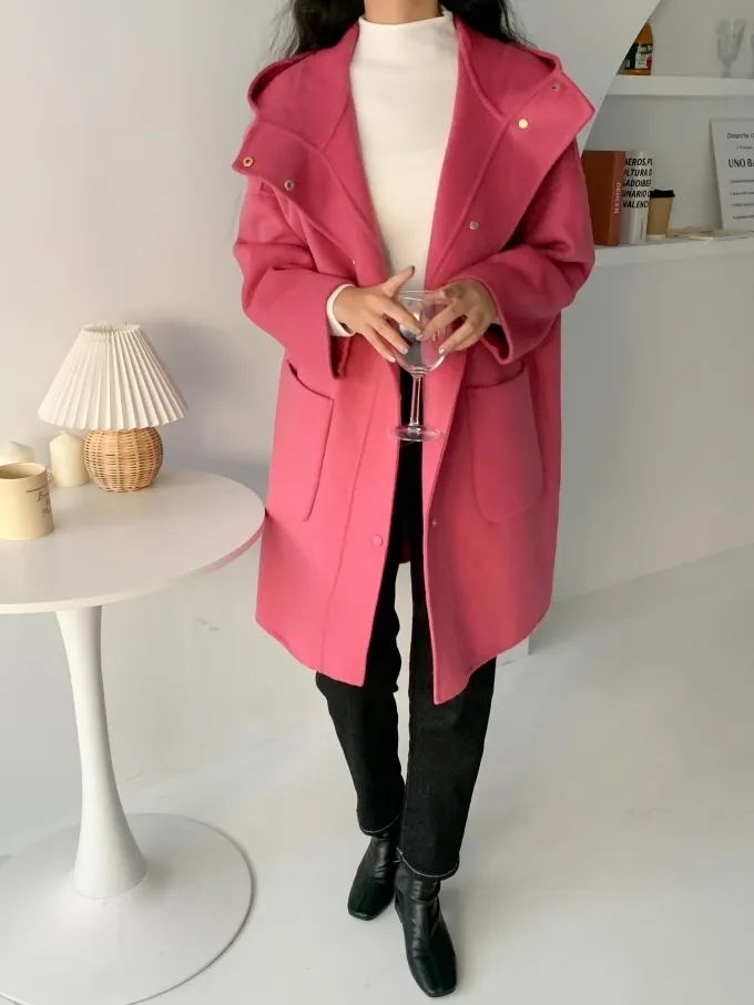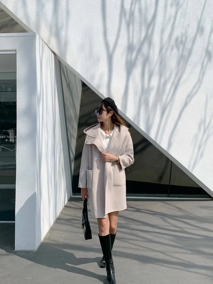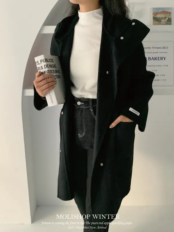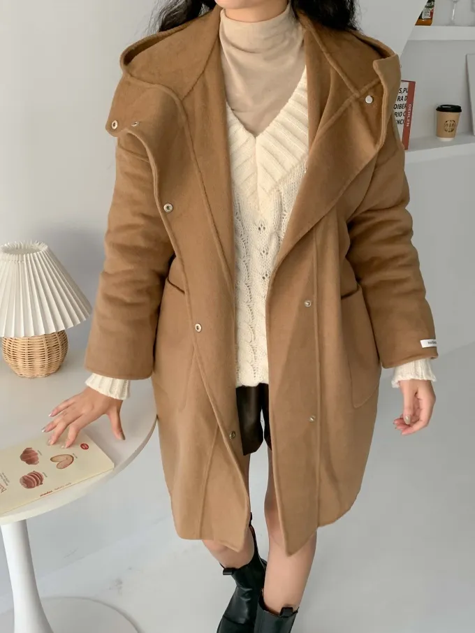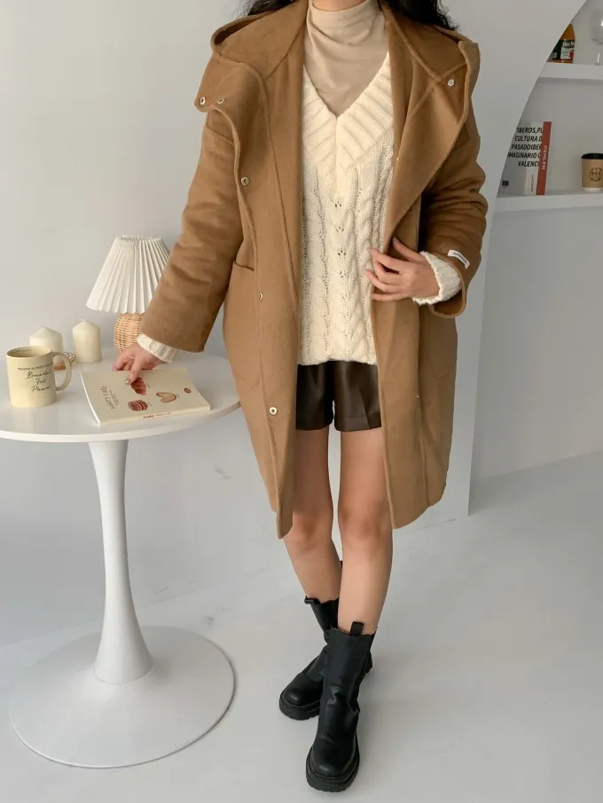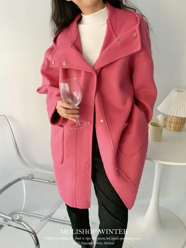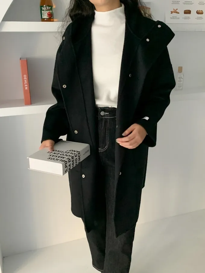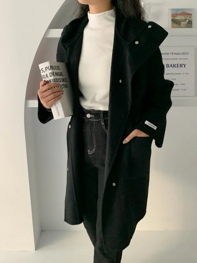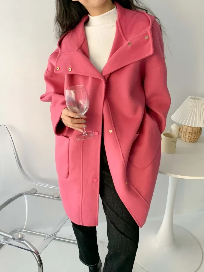 【福利標】雙面100%羊毛寬鬆連帽軟毛呢中長版大衣外套_B16