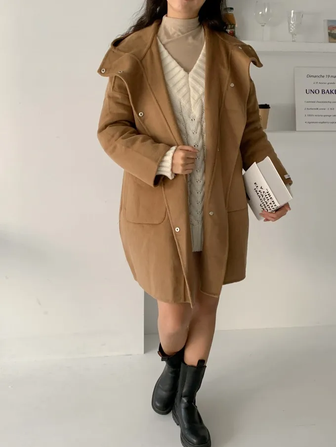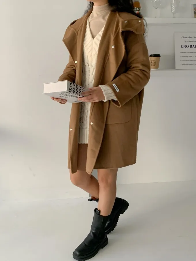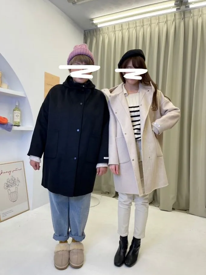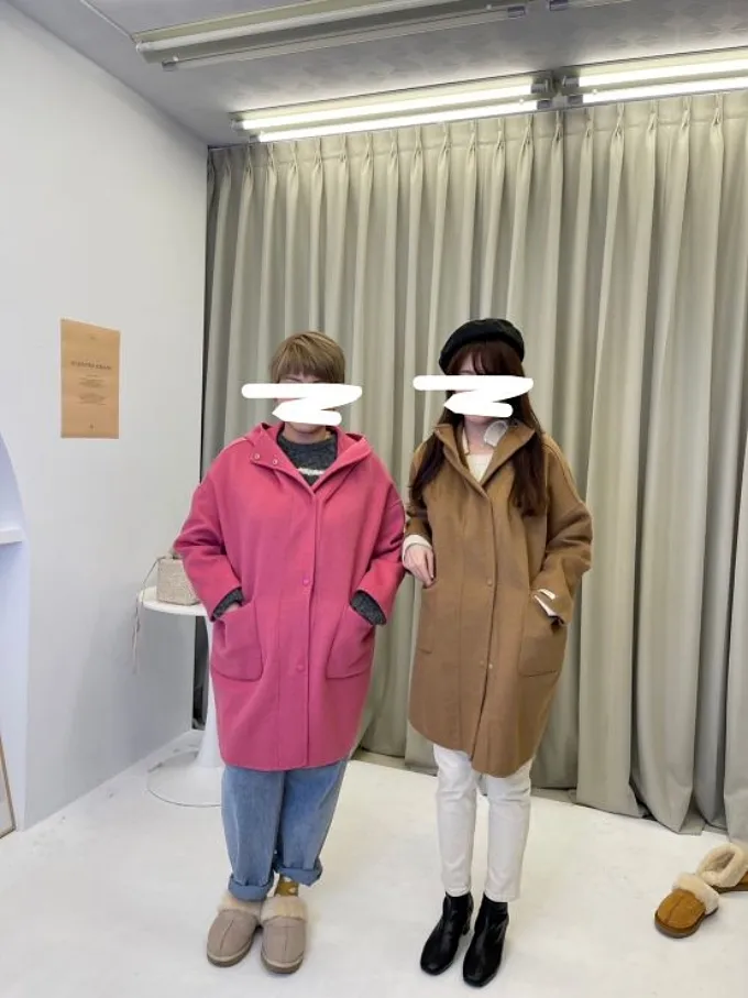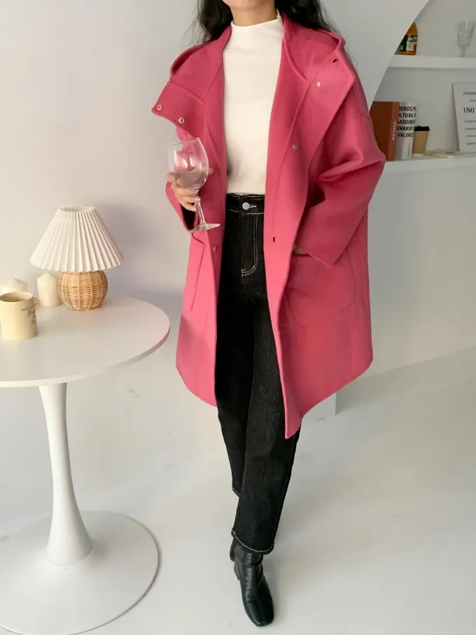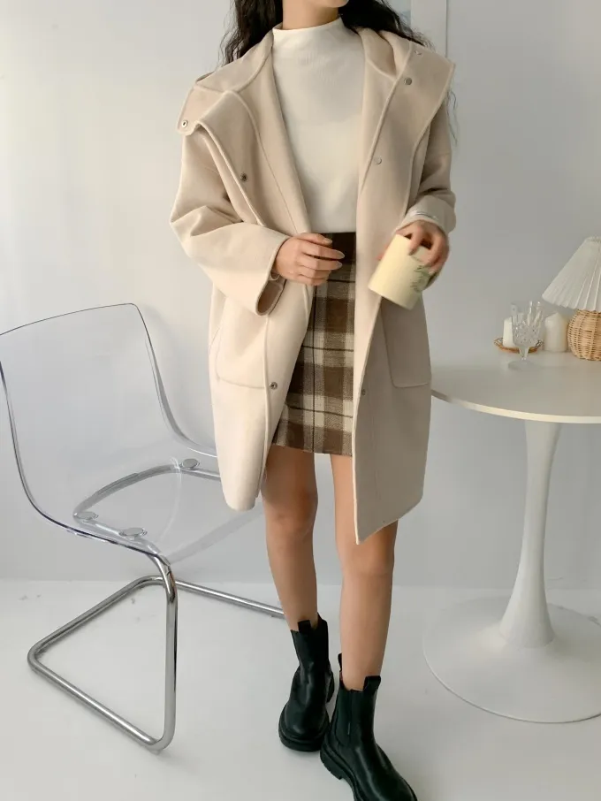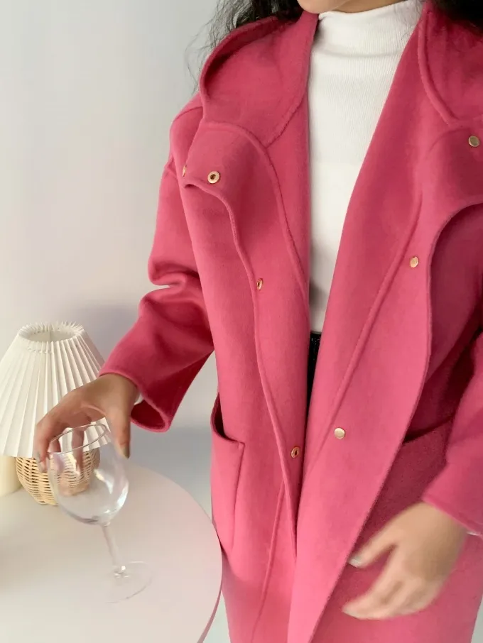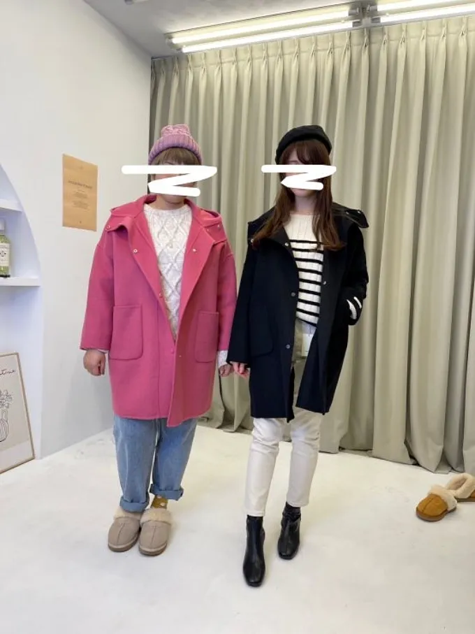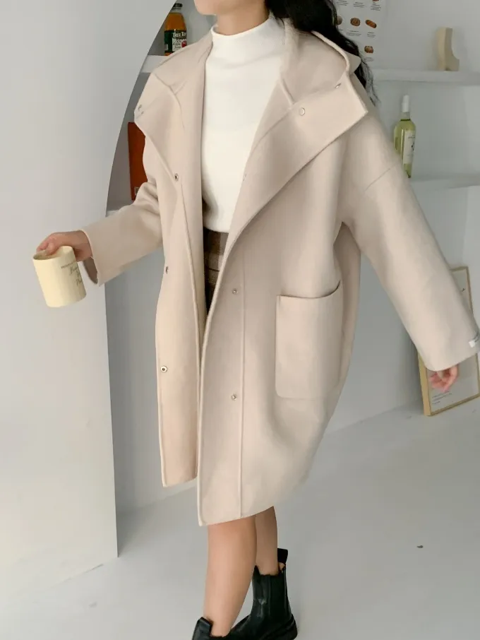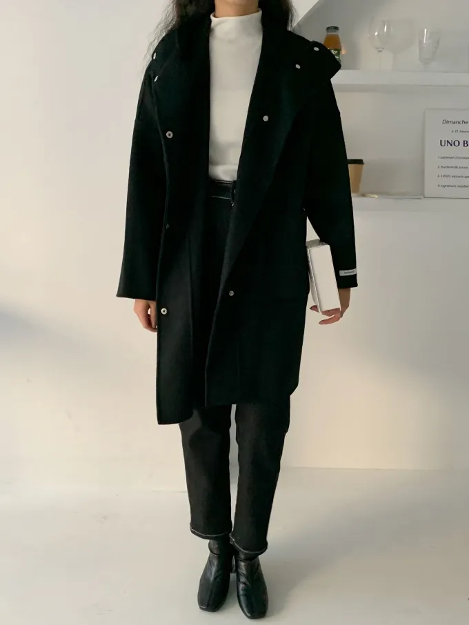 【福利標】雙面100%羊毛寬鬆連帽軟毛呢中長版大衣外套_B16