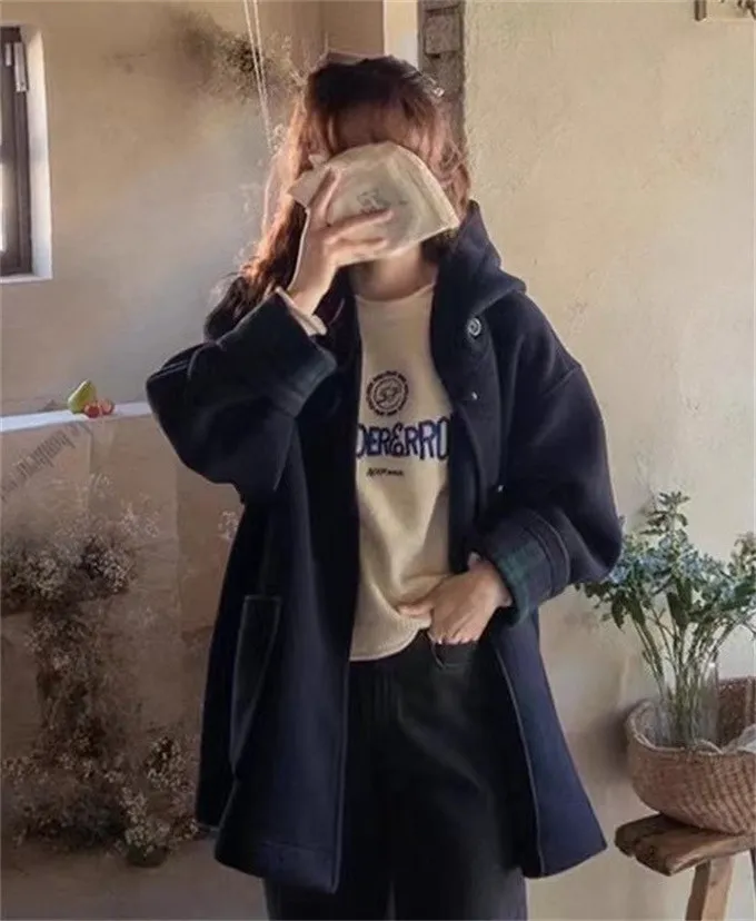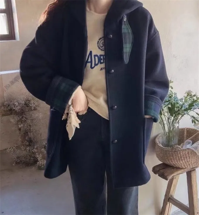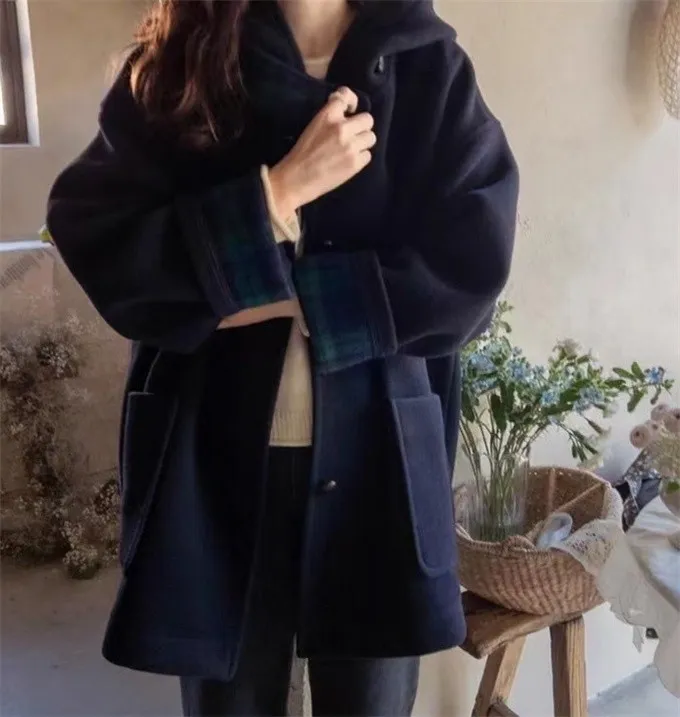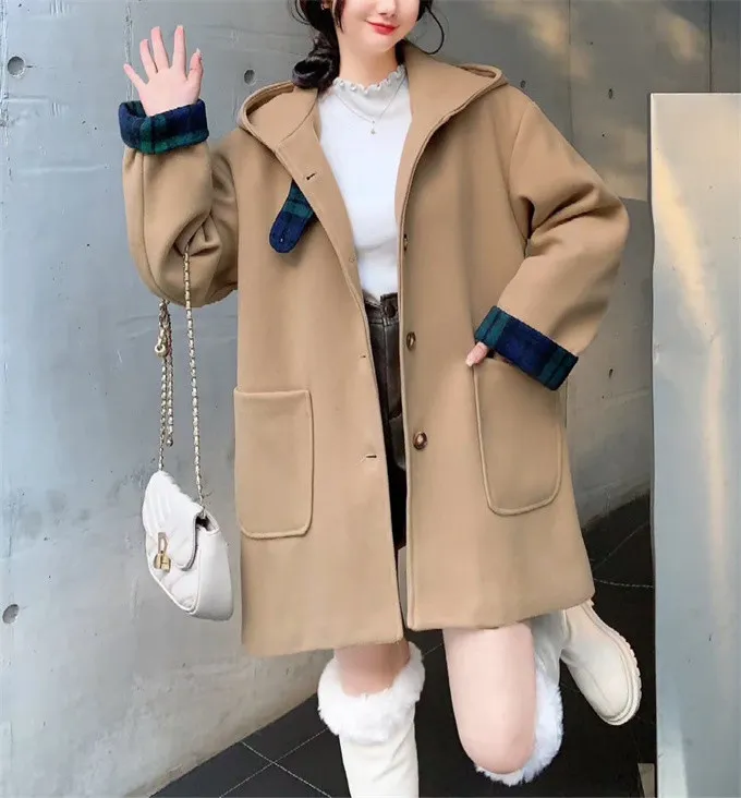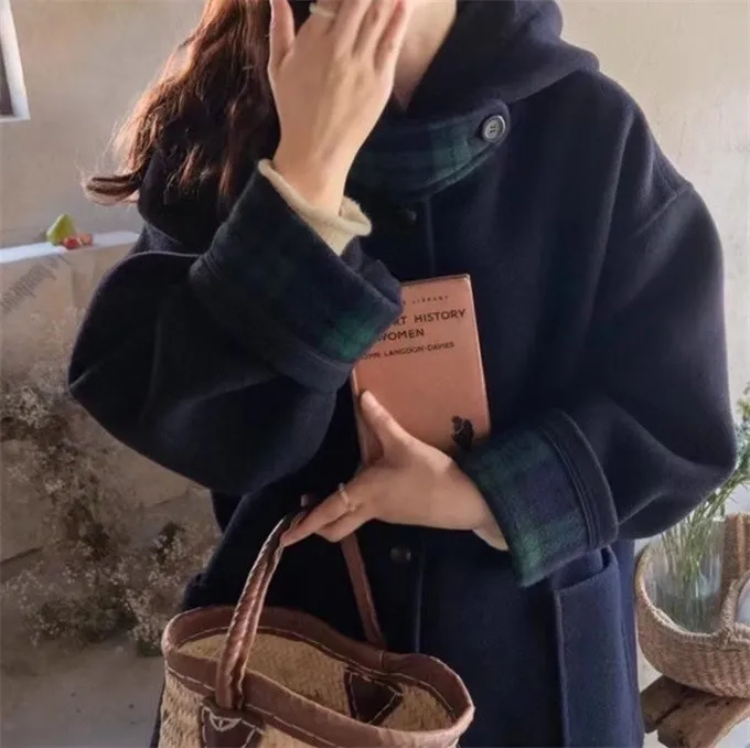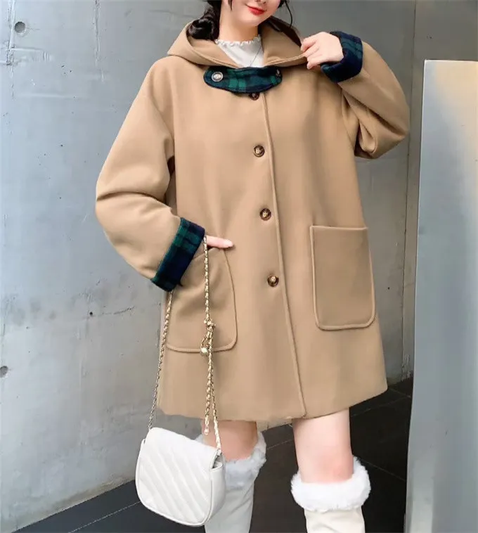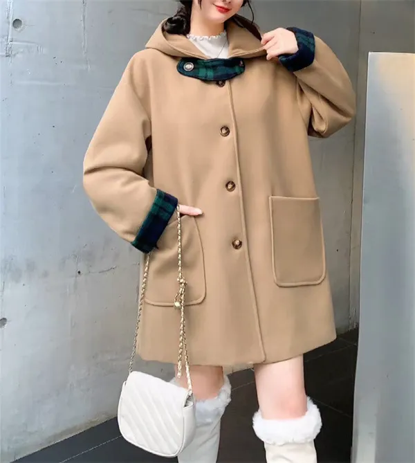 復古格紋拼接毛呢大衣_B21