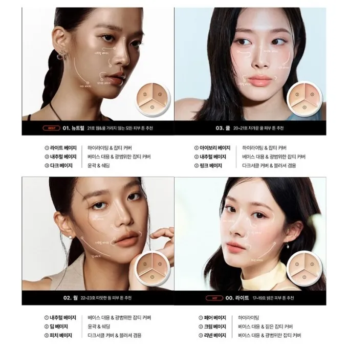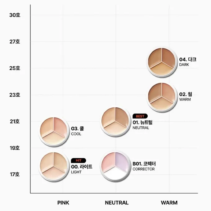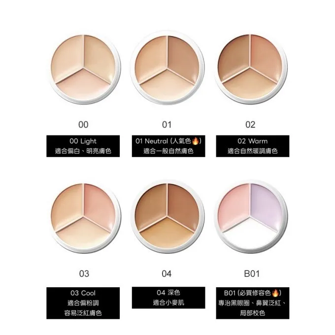【色號推薦】00 Light:適合偏白、明亮膚色01 Neutral:適合一般自然膚色(人氣色)02 Warm:適合自然暖調膚色03 Cool:適合偏粉調、容易泛紅膚色04 深色:適合小麥肌B01 校正:專治黑眼圈、鼻翼泛紅、局部校色(必買修容色)-‐‐‐‐‐‐‐‐‐‐‐‐‐‐‐‐‐‐‐-產地 : 韓國容量 : 15g