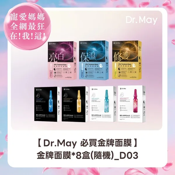【隨機8盒】 DR. MAY 專業保濕面膜(4片/盒) DR. MAY 專業亮白面膜(4片/盒) DR. MAY 美博士專業修護面膜(4片/盒) DR. MAY 專業級大安瓶水光黑面膜(4片/盒) DR. MAY 專業級大安瓶修護黑面膜(4片/盒) DR. MAY 安瓶美白面膜(4片/盒) DR. MAY 安瓶補水面膜(4片/盒)