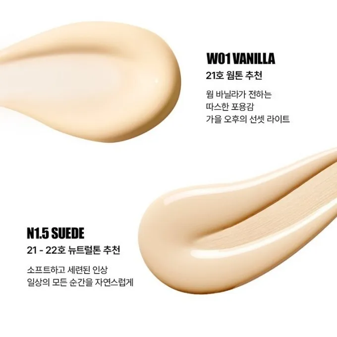 【色號介紹】W01 VANILLA(自然白皙,暖調21號) 適合偏白膚色、喜歡妝感提亮一點的人 N1.5 SUEDE(自然色,中性調21-22號) 適合大多數日常膚色,妝感自然耐看 -產地 : 韓國容量 : 15g效期 : 最新效期(滿足一年半以上)