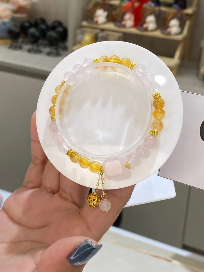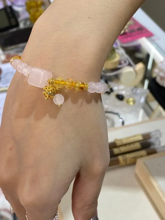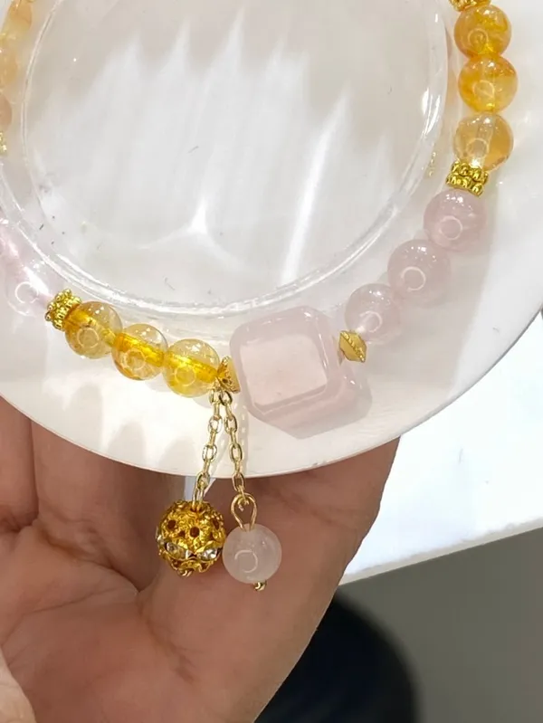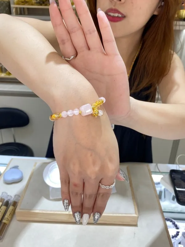 手圍:16cm內 組合能量(黃水晶 × 粉晶方塊) 黃水晶:吸引財富與好運,讓生活充滿陽光與活力(顧胃) 粉晶方塊:溫柔愛情+穩定關係,讓妳散發甜美氣場(顧心) 一起配戴:形成「財富+愛情」的雙能量,象徵事業順利、感情甜蜜。 👉簡單記:黃水晶=財運,粉晶方塊=愛情人緣 👉組合寓意:財富桃花雙收,愛情事業都豐盛!