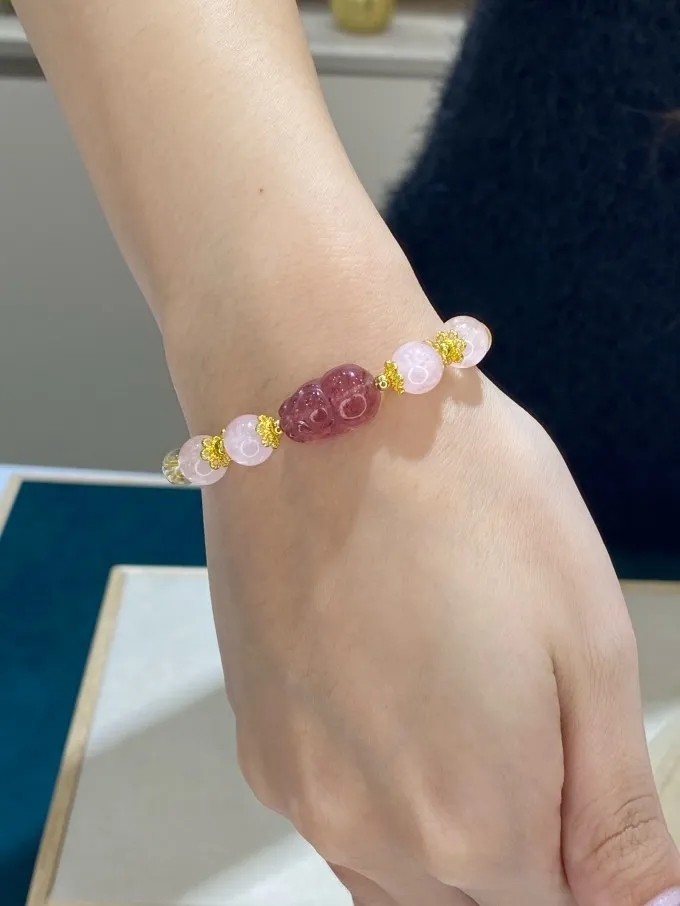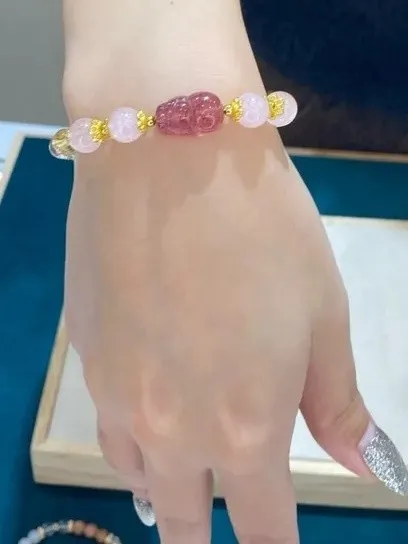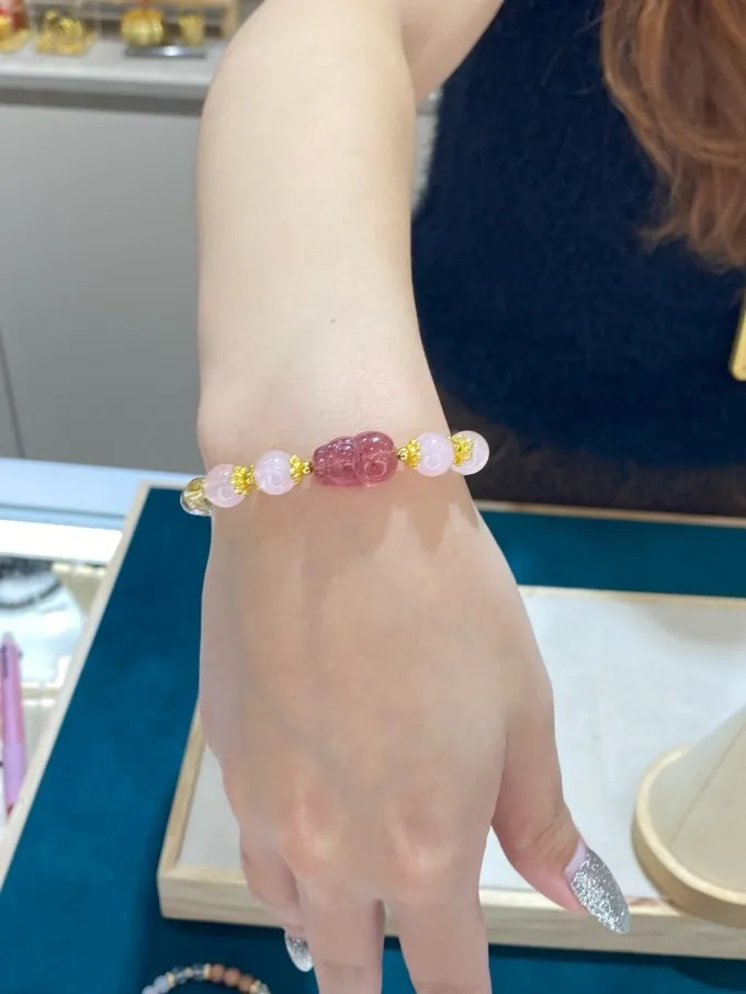 🍓 草莓晶貔貅 草莓晶:甜美磁場,招桃花、增進人緣與愛情運 貔貅:招財聚寶、鎮守財富,帶來守護力量 🤍 白水晶 最強的淨化石,淨化負能量 平衡磁場,放大並加乘其他晶石能量 提升專注力與清晰思維 💗 粉晶 愛情與人緣之石,帶來柔和療癒 打開心輪,增強吸引力與親和力 守護感情,促進人際和諧 👉 合在一起:草莓晶貔貅的招財人緣 + 白水晶的淨化放大 + 粉晶的愛情守護,形成 財富、人緣、愛情三合一的能量組合。