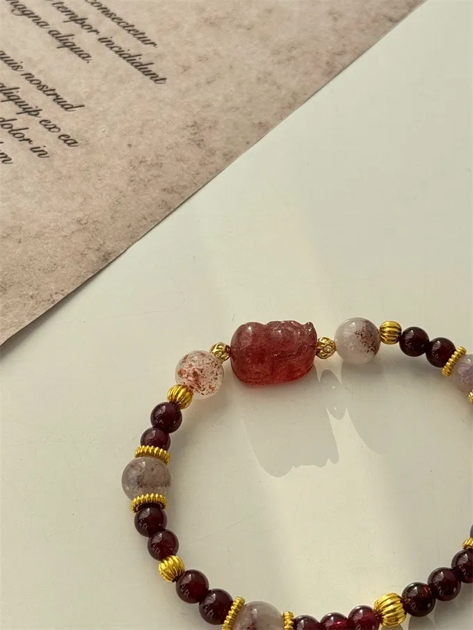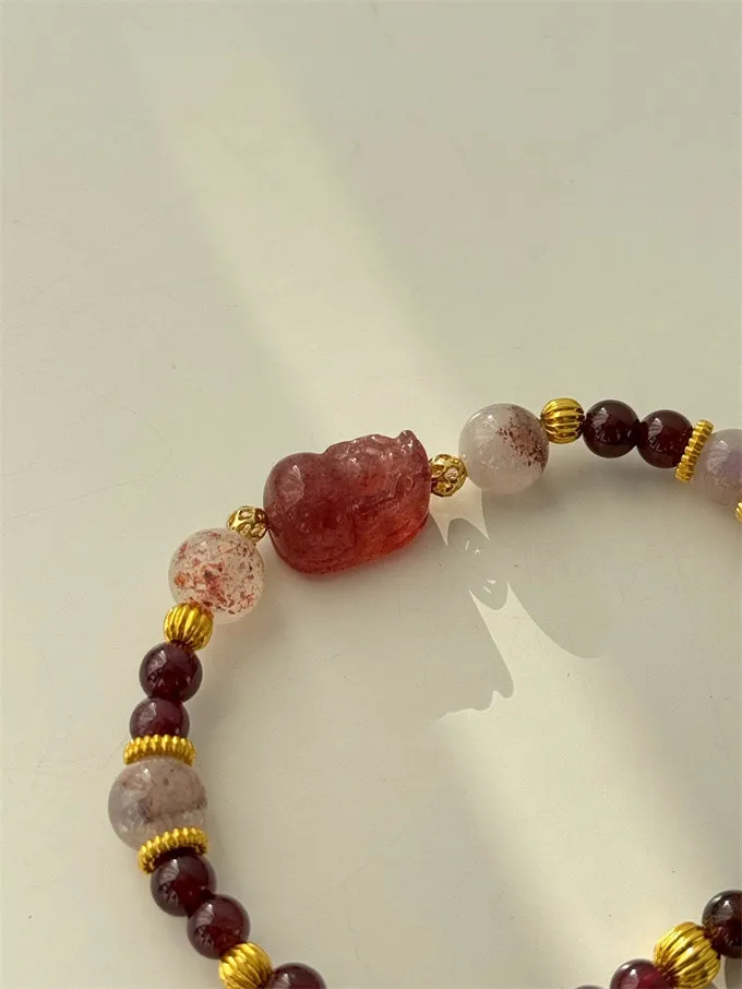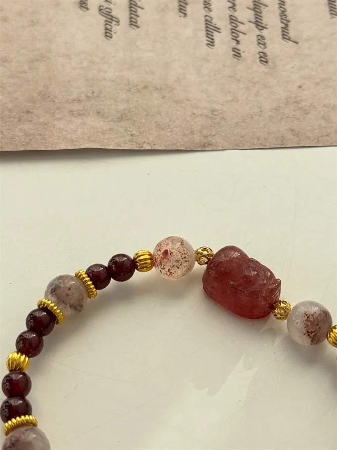 草莓晶貔貅穩定情緒並增強愛與自信,紅石榴提升勇氣與行動力,超七增強直覺與靈感,三石互相加持,形成清晰穩定的能量循環,讓心靈平衡、氣場純淨,正向能量自然流動