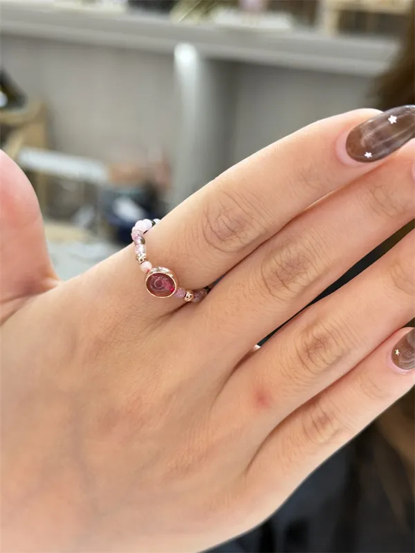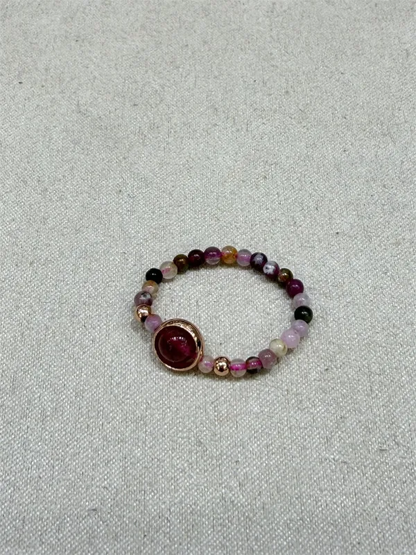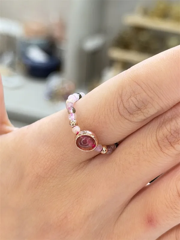 戒指戴在指尖,是妳每天低頭打字、滑手機或做家事時最常看見的風景。繽紛的碧璽配上紅潤的草莓晶,是在溫柔地提醒我:「日子再忙,也要記得活得多采多姿,留點時間給自己。」