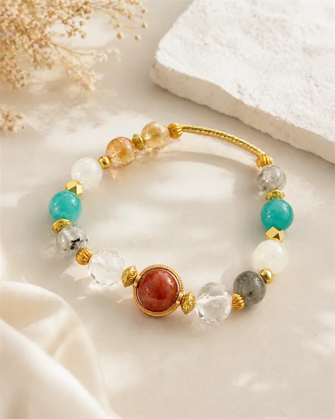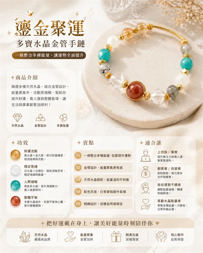 這款是多寶水晶+金管設計,把不同能量的水晶集中在一條手鏈裡