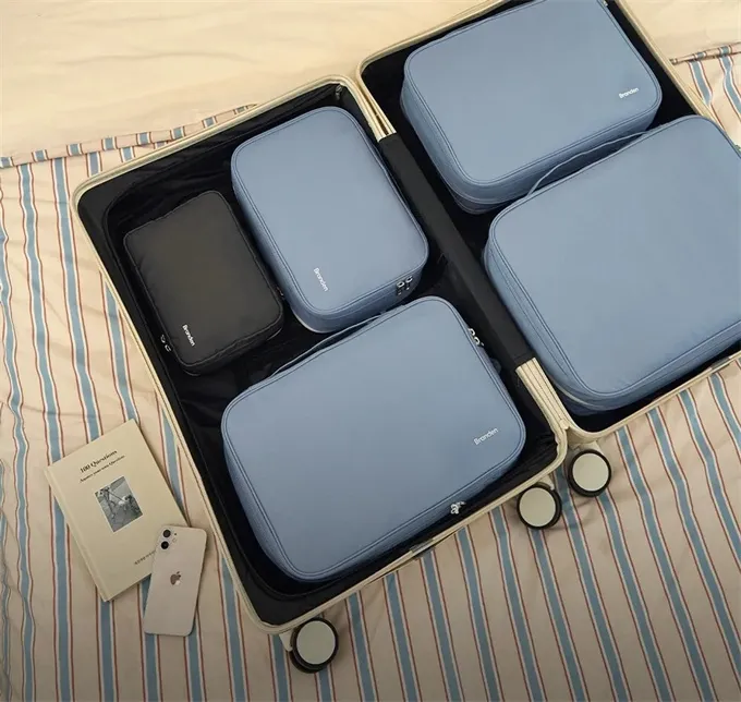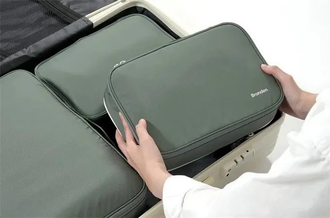 將衣物、毛巾、內衣褲、襪子等較為蓬鬆的物品放入壓縮收納袋中,透過拉鍊或捲壓等方式將空氣排出,可大幅減少物品所佔體積,節省行李空間。 -