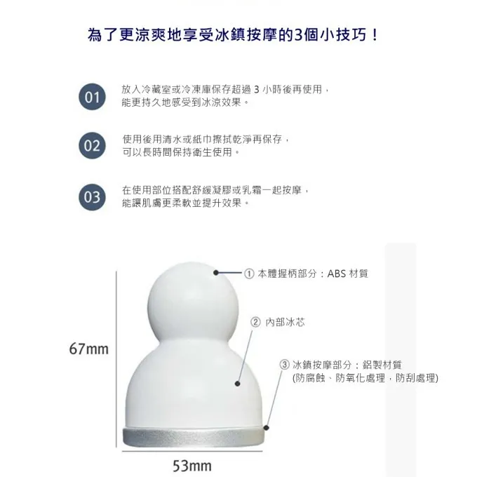 ✓3分鐘冰出小V臉,腫臉急救超有感 ✓熬夜不怕腫,一滾馬上醒顏 ✓冰冰滾一滾,美顏緊緻快上線 . ➤鋁合金冰頭 → 急速冰感滲透,退腫快又抗氧化 ➤一擦即淨 → 不藏污不卡垢,清潔超輕鬆 ➤ABS防滑胖胖手柄 → 好握不手殘,滾起來超順手. 〖小撇步〗 前一晚丟冰箱,隔天早上用 ➝ 人瞬間醒透透! 搭配乳霜/凝膠使用更滑順,保養吸收快到飛起
