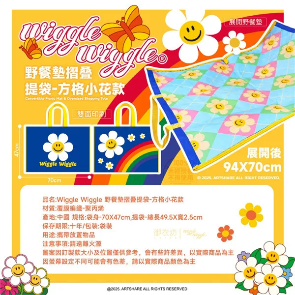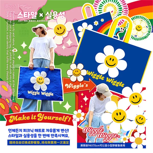✓一袋多用,購物野餐都能搞定 ✓顏值+功能雙滿分,出門就是要帶它 ✓少女心爆棚的實用神器,限量不等人 . 〖Wiggle Wiggle 兩用購物袋〗 顏值爆表 功能滿點 大容量 可折疊 秒變野餐墊 少女心+實用度 一袋多用,顏值+功能雙滿分 出門必備神器,限量售完就沒啦! . 〖購物袋模式〗 ➤超市採買 ➤通勤上班 ➤出門旅行 ➤一袋搞定!折疊收納不佔位,隨手帶走超輕巧 . 〖野餐墊模式〗 ➤拉鍊一拉 ➝ 秒變野餐墊! ➤沙灘 草地 音樂祭 想躺就躺! ➤防潑水材質,飲料灑了也OK,戶外休閒更愜意