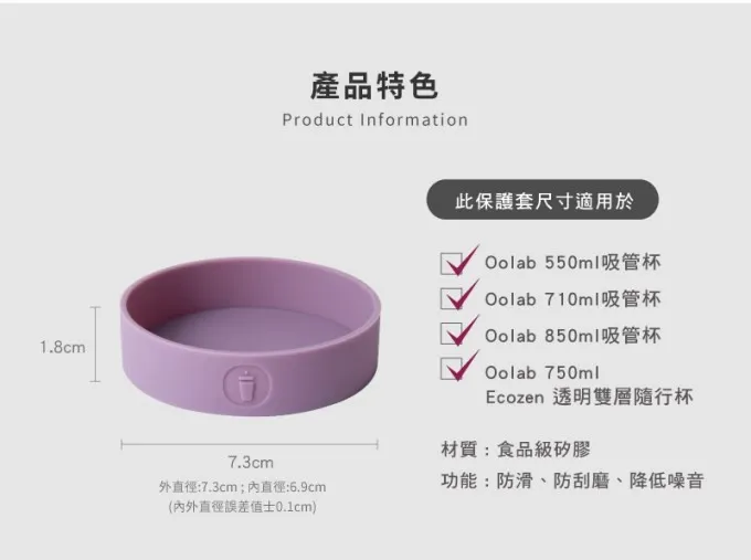 杯底防刮保護套商品特色 (1)多種顏色同款任您搭配 ⭐全新設計款式!搭配各款Oolab吸管杯 (2)SGS認證食品及矽膠 ⭐安全 / 環保 / 無毒!使用最安心 (3)專為吸管杯量身訂做 ⭐完美包附杯底超服貼!矽膠防滑防刮磨 (4)完美保護杯底邊角 ⭐防止嗑碰造成磨損掉漆、降低摩擦噪音 (5)可愛小巧排氣孔 ⭐排除套裝時產生的空氣!讓保護套更貼合