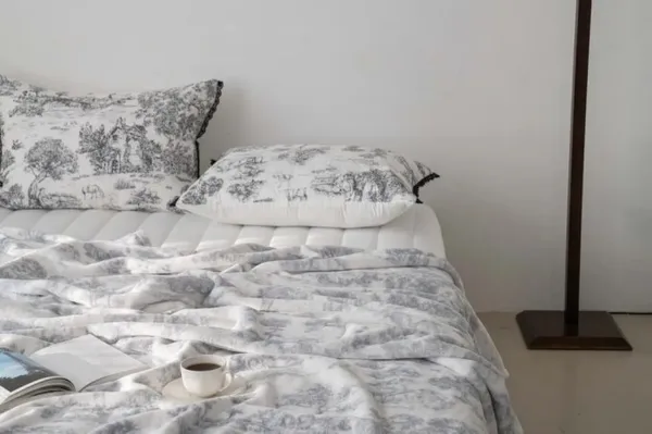 ▸ 法式浪漫印花,細節滿分 靈感取自法國鄉村風的手繪風景畫,在低飽和的灰、粉、米色調中展現高雅氣質,搭配極簡空間更添質感。