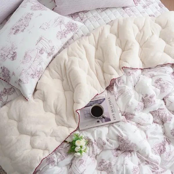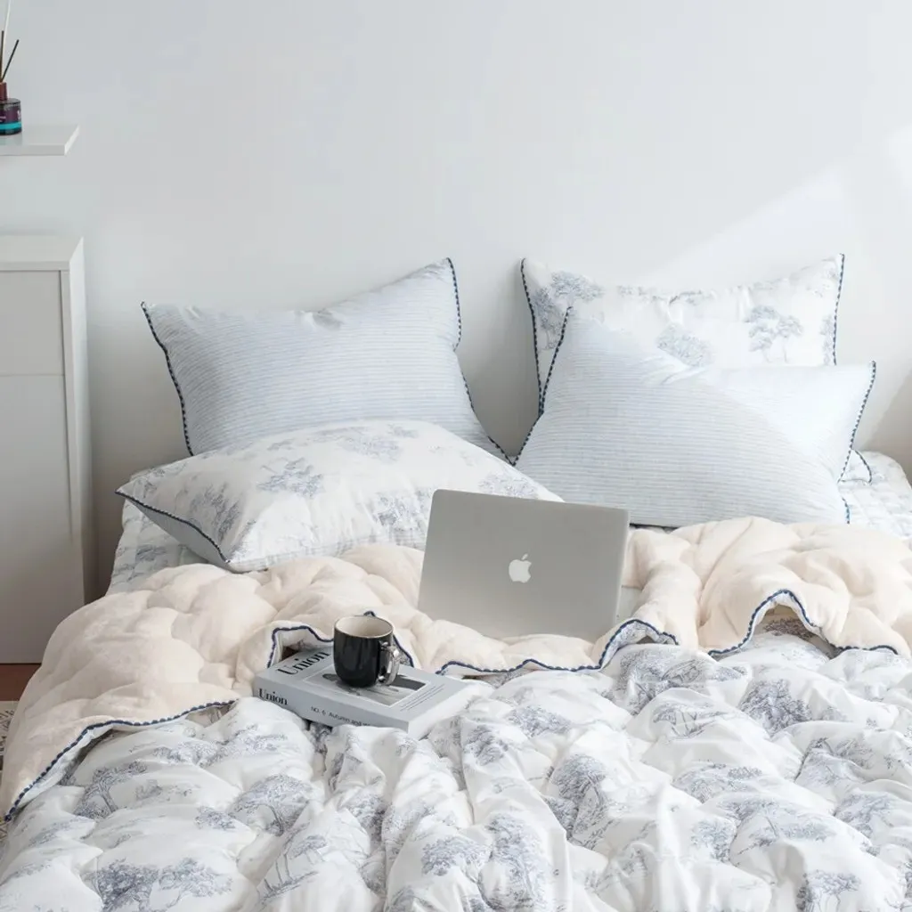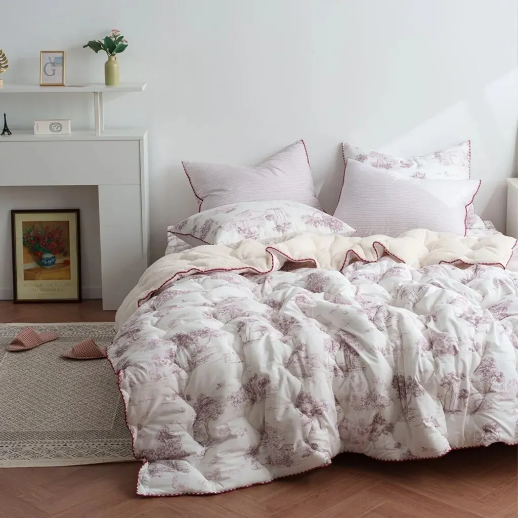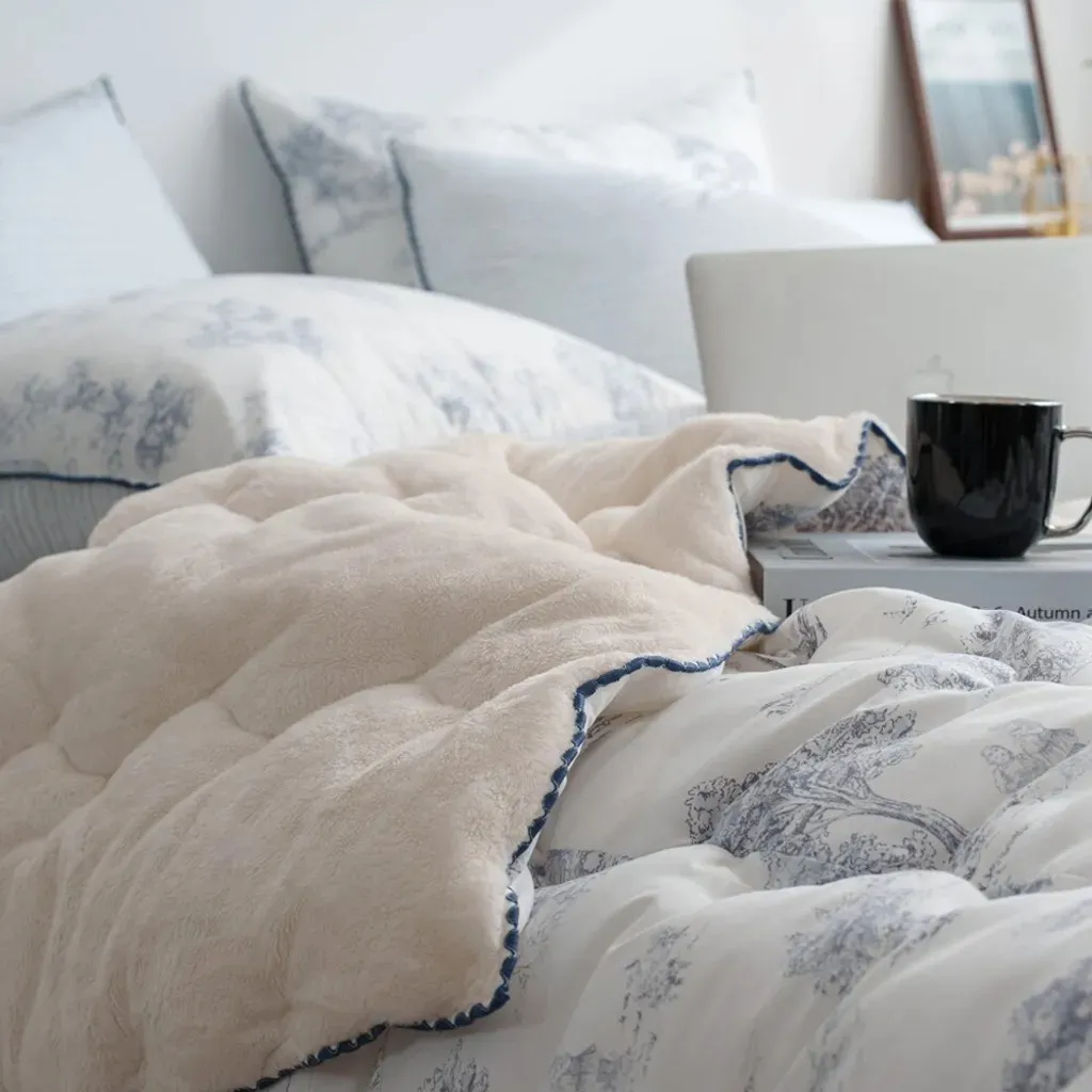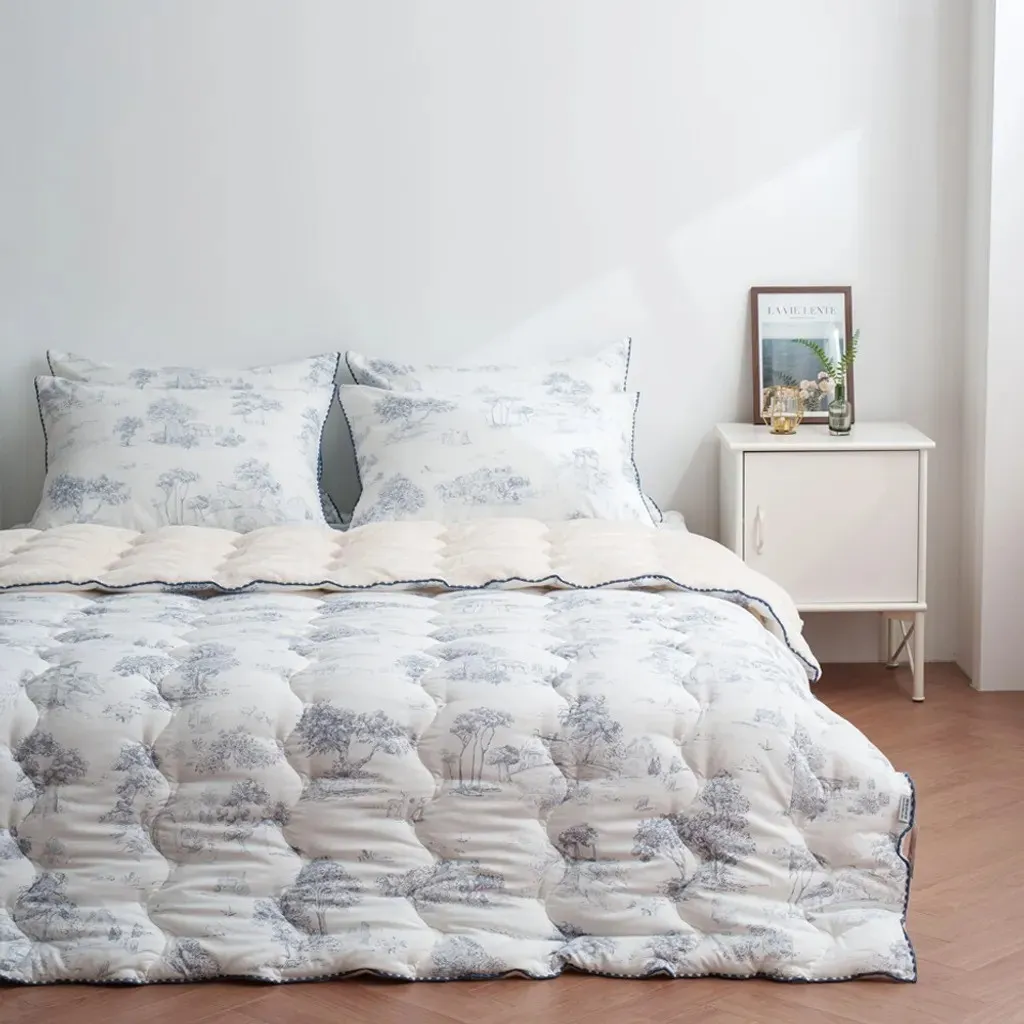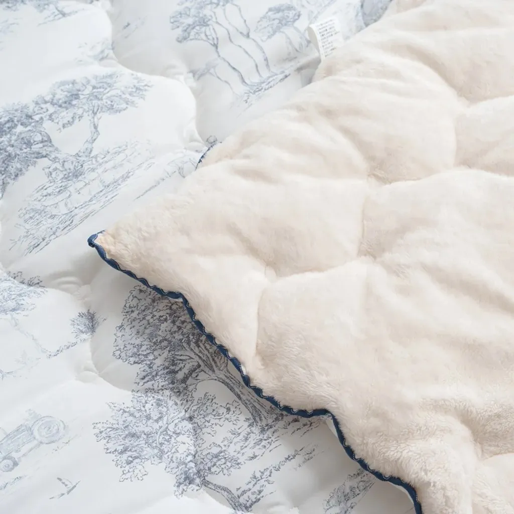 材質:(圖案面)聚酯纖維100% (素色毛絨面)5mm毛絨超細纖維100% 🌿 法式田園時光|單面絨冬被 在日常裡留住一份慢慢的優雅與溫暖 融合細膩的法式田園印花與奶油般柔軟的毛絨觸感,讓每一晚都像住進南法鄉間的小旅館。兼具高顏值與實用性,是冬季床組中最令人心動的一款。 - ✨ 賣點 1|法式田園插畫印花,打造輕奢睡眠場景 採用高質感聚酯纖維印花面料,呈現細膩如手繪般的田園風景——樹影、莊園、鄉村小路都柔和地躺在布面上。 • 清新藍、溫柔粉兩色可選 • 提升臥室亮度與層次感 • 不挑家居風格,無印、北歐、法式皆完美適配 - ✨ 賣點 2|5mm 奶油絨面,一蓋就暖的幸福觸感 背面採用 5mm短毛絨超細纖維,手指觸碰時的柔滑細膩,宛如雲朵融化在掌心。 • 保暖度升級,冬夜一蓋便感受幸福暖流 • 毛絨蓬鬆但不厚重,貼身包覆更輕盈 • 全家大小都能安心使用 - ✨ 賣點 3|冬季必備的保暖度 × 舒適度完美平衡 .聚酯纖維表布=防風、耐用、不易起毛球 .短毛絨裡層=溫柔包覆、有如暖暖包般的即刻暖感 .填充蓬鬆度佳=不壓身、不悶熱,睡覺更自在 - ✨ 賣點 4|兩種質感一次擁有,四季皆宜的百搭美感 正面為法式田園插畫,背面為奶油絨面,視覺與觸感都能自由切換。 • 冬天蓋毛絨面保暖度滿分 • 其他季節可當作床罩或薄被使用 • 一件就能讓房間風格大加分 - ✨ 賣點 5|細節滿分的法式滾邊設計 邊緣採用同色系波浪滾邊,讓整體更加精緻,視覺柔和又典雅,提升整體質感與層次。 - ✨ 賣點 6|可整件機洗,日常保養更輕鬆 • 耐洗不變形 • 毛絨不易掉毛 • 不褪色、耐用性佳 天天都能享受乾淨蓬鬆的暖暖睡感。 - 💛 「法式田園時光」適合誰? ✔ 喜歡法式浪漫氛圍的你 ✔ 想添置高顏值又實用冬被的家庭 ✔ 容易手腳冰冷、想要快速暖被的人 ✔ 想讓臥室瞬間變美的房間佈置愛好者