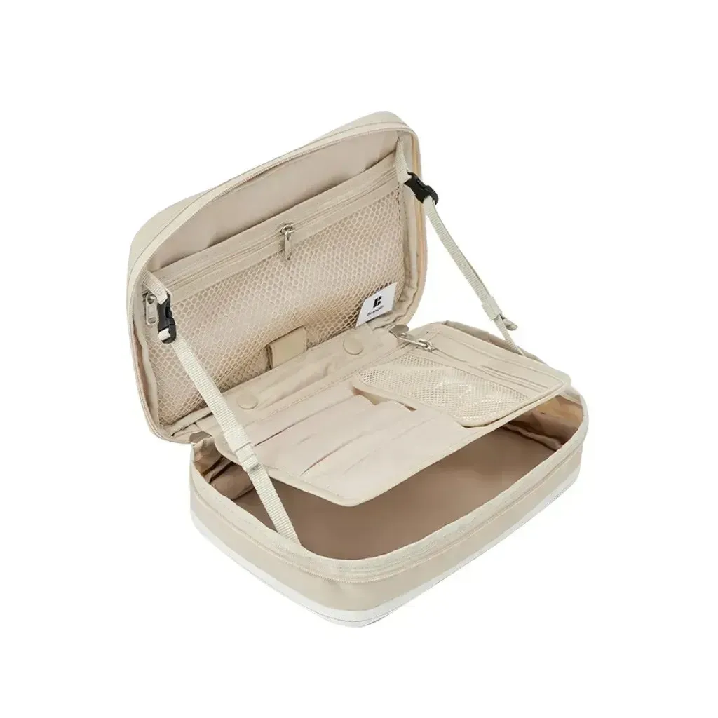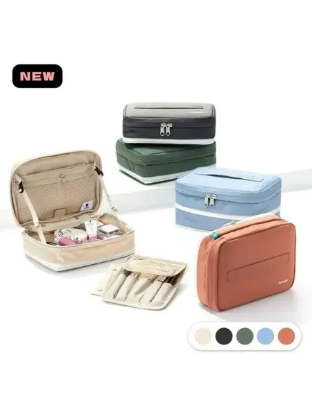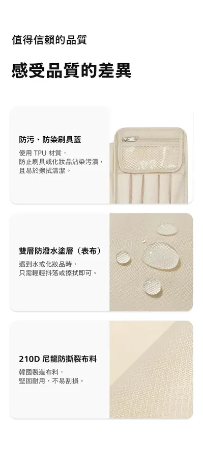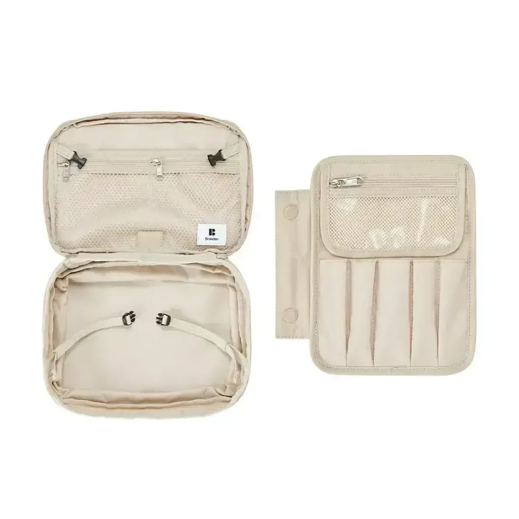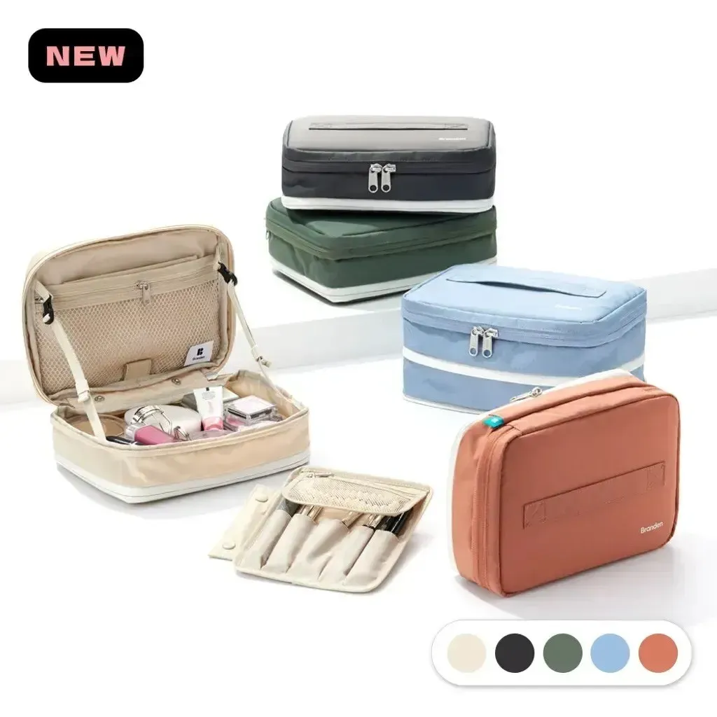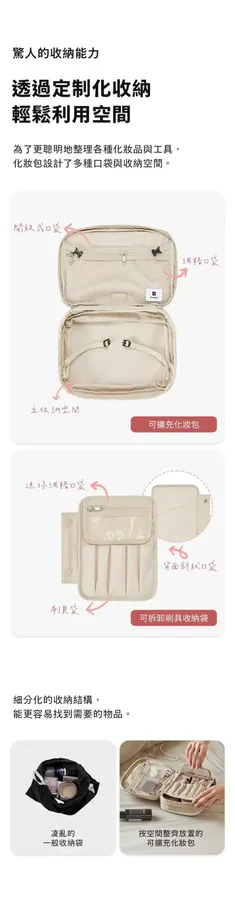 💄Branden 擴展型化妝包 大容量 × 多層收納 × 一拉擴展 = 行動化妝台! 從簡約外型到細膩內裝,專為每位愛整齊的你設計。 - 🔹 多重收納結構,井然有序不凌亂 讓化妝包不再只是「堆疊大雜燴」,從彩妝品、保養品到刷具與面膜,全部都有專屬空間: ✅ 主收納區:底部空間可收納各式罐裝保養、粉餅、香水、隔離乳等 ✅ 雙層內蓋網袋:適合放面膜、化妝棉、棉花棒、小鏡子 ✅ 可拆式刷具專區:5格刷具筆位 + 拉鍊收納袋,可獨立使用 ✅ 隱藏式斜口袋:面膜片或薄型化妝品可整齊收納不變形 - 🔹 可擴充設計,2.7L ➝ 4.5L 輕鬆轉換 ✔️ 收納前容量為2.7L,適合日常、短途外出 ✔️ 拉開下層擴展拉鍊,即可升級至4.5L! ✔️ 擴展厚度+5cm,讓你出遊、出差也能一包裝齊全彩妝保養 只裝重點的「精簡派」或瓶瓶罐罐全都要的「實用派」,這一包都能搞定! - 🔹 展開即用,變身迷你化妝台 打開後就像一座 可站立的行動化妝台,桌上、床邊、洗手台隨開即用 上蓋配有 雙邊調節繩,可穩定撐起角度不傾倒 可搭配隨身小鏡使用,無論在旅館、辦公室或外出場合都能從容上妝補妝 - 🔹 材質講究,輕盈又防水防汙 ☔ 表布:210D尼龍 Ripstop ➝ 抗撕裂、防潑水 💧 雙層生活防水塗層 ➝ 化妝水潑濕可直接擦拭 🧽 可拆刷具袋採用TPU防污材質,粉底液也不怕沾染 - 🔹 色系質感滿分|5色可選 🟤 杏色|軍綠|⚫ 深灰|🧡 磚粉|🔵 天空藍 簡約柔和,無論通勤還是旅行都百搭。