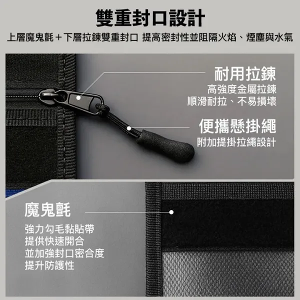 採用防水外層+拉鍊+魔鬼氈封口 全面密封