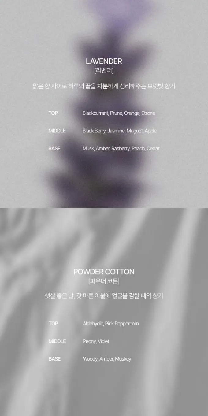A.粉感棉花像曬過的棉被香氣乾淨柔軟、溫暖舒服前調|醛香、粉紅胡椒中調|牡丹、紫羅蘭後調|木質、琥珀、麝香 B.薰衣草清新花香帶點沉穩感療癒又放鬆就像淡香水一樣有層次感前調|黑醋栗、李子、橙、清新氣息中調|黑莓、茉莉、鈴蘭、蘋果後調|麝香、琥珀、覆盆子、蜜桃、雪松-‐‐‐‐‐‐‐‐‐‐‐‐‐‐‐‐‐‐‐-產地 : 韓國規格 : 30ml